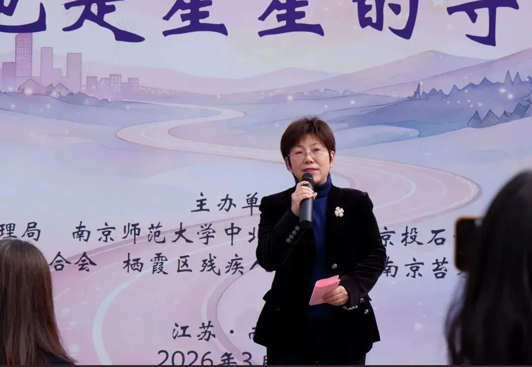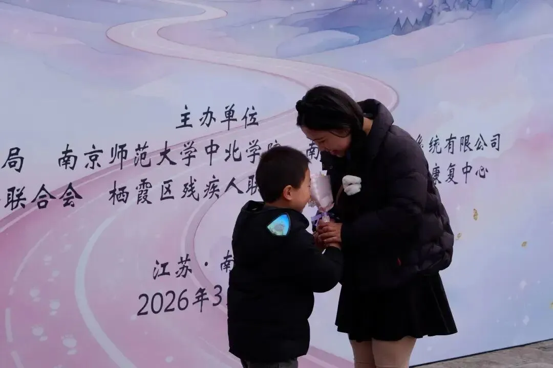 随后,栖霞区残疾人联合会理事长黄伟登台致辞,字字句句饱含温情与关怀。“梅花是南京的市花,它坚韧高洁、凌寒绽放的精神,恰如这群默默守护孤独症儿童的女性朋友们,以温柔的力量坚守奉献、从未言弃。”黄伟理事长代表栖霞区残联,向所有孤独症儿童背后的女性照顾者致以崇高敬意,也向深耕孤独症事业的各界女性工作者送上节日祝福。她介绍,栖霞区始终深耕孤独症事业发展,2025年启动孤独症全程服务全国先行先试工作,落地康复救助等十大行动,2026年更是大力推进科技助残在孤独症领域的先行先试。