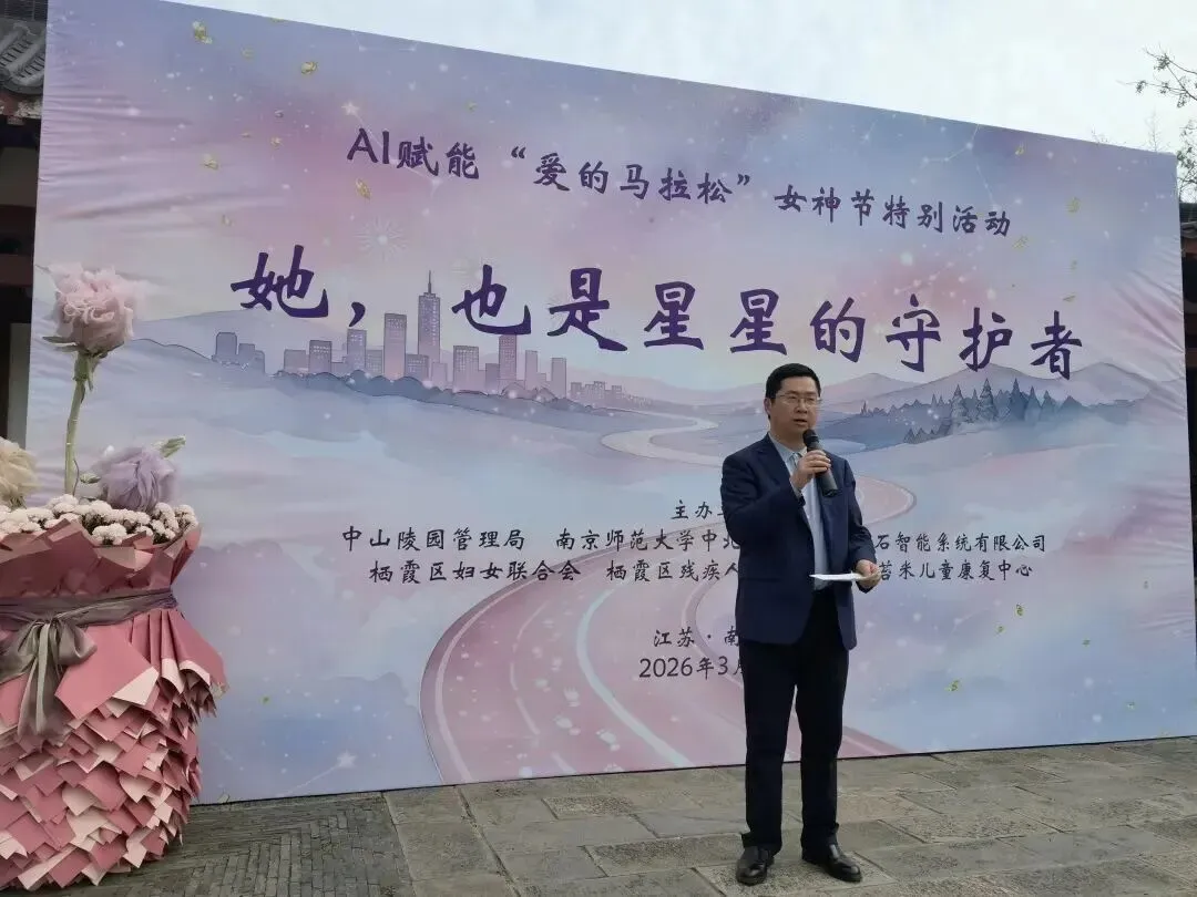 梅花初绽香满金陵,温情暖意漫溢钟山。在三八国际妇女节这个特别的日子里,一场以“AI赋能‘爱的马拉松’——‘她,也是星星的守护者’”为主题的公益活动在南京梅花山景区温情启幕。本次活动由中山陵园管理局、南京师范大学中北学院、栖霞区残疾人联合会、栖霞区妇女联合会、南京投石智能系统有限公司、南京苔米儿童康复中心联合主办,南京市玄武区人工智能企业商会、江苏省工业设计学会、江苏省科普美术家协会公共艺术专委会、江苏省创新创业研究会健康安全应急科技专委会联合协办,商会部分企业会员单位代表出席活动。