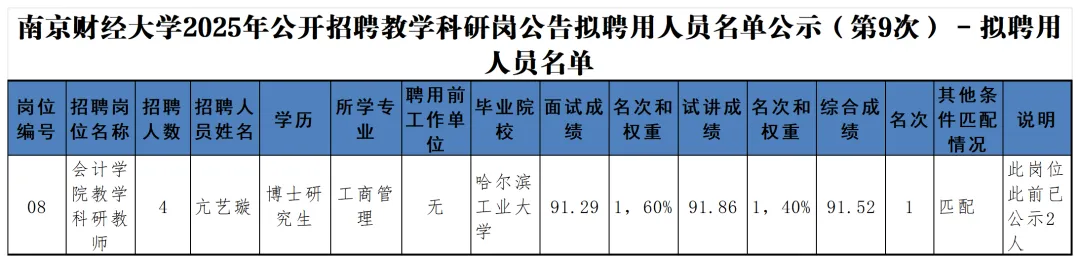 南京财经大学2025年公开招聘教学科研岗公告拟聘用人员名单公示(第9次)