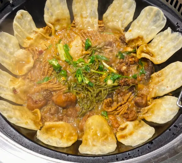 【地锅鸡·做法简述】得用那种黑黢黢的老铁锅,烧的是木柴。土鸡切块,先用热油爆炒出香,加酱料焖炖。最绝的是那圈“喝饼”——面粉和水揉得软硬适中,贴在锅边。一半浸在浓稠的汤汁里吸味,一半在锅壁上烘得焦脆。吃的时候,先吃饼,那口感,外脆里糯,吸满了鸡肉的鲜香,比肉还抢手。