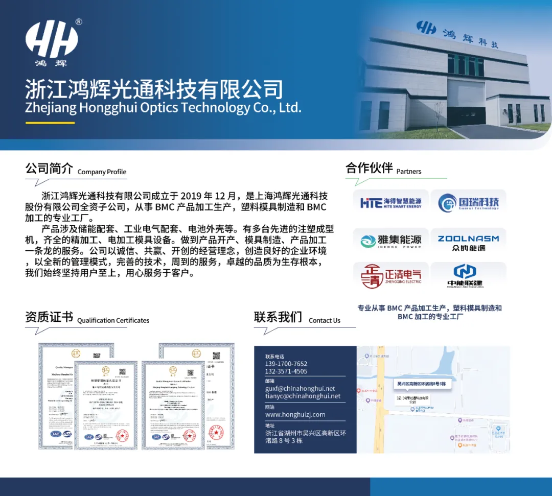 浙江鸿辉光通科技有限公司成立于2019年12月,是上海鸿辉光通科技股份有限公司全资子公司,从事BMC产品加工生产,塑料模具制造和BMC加工的专业工厂。