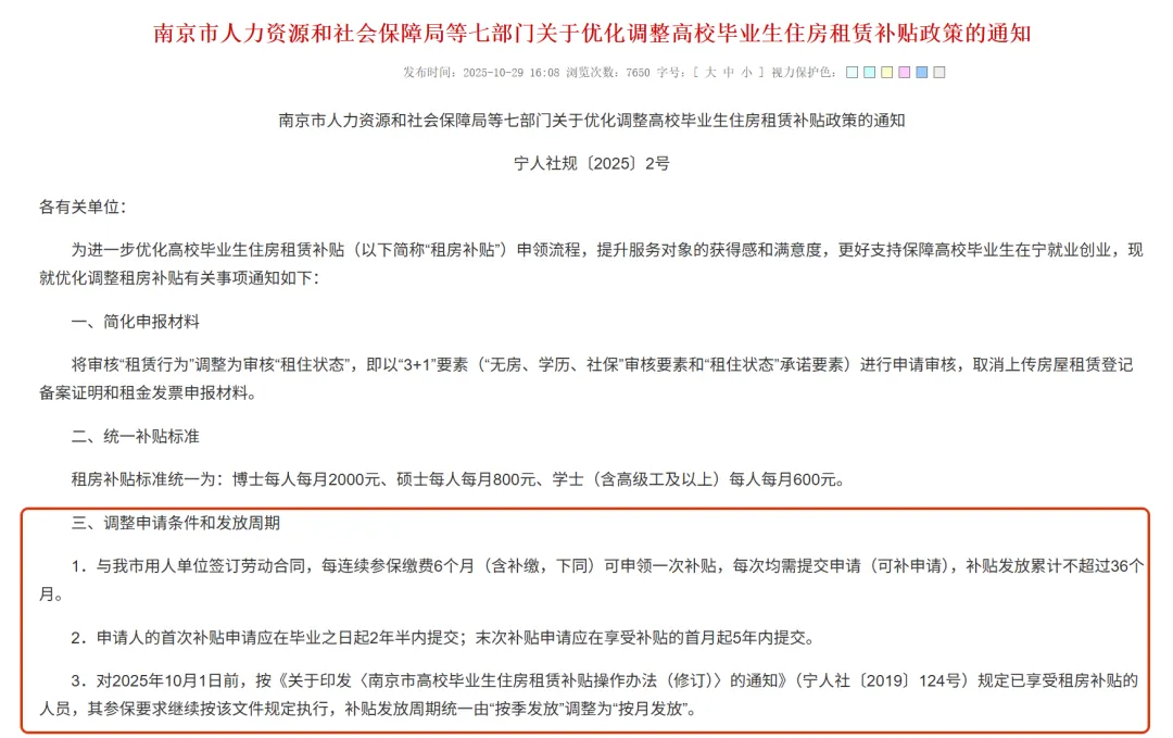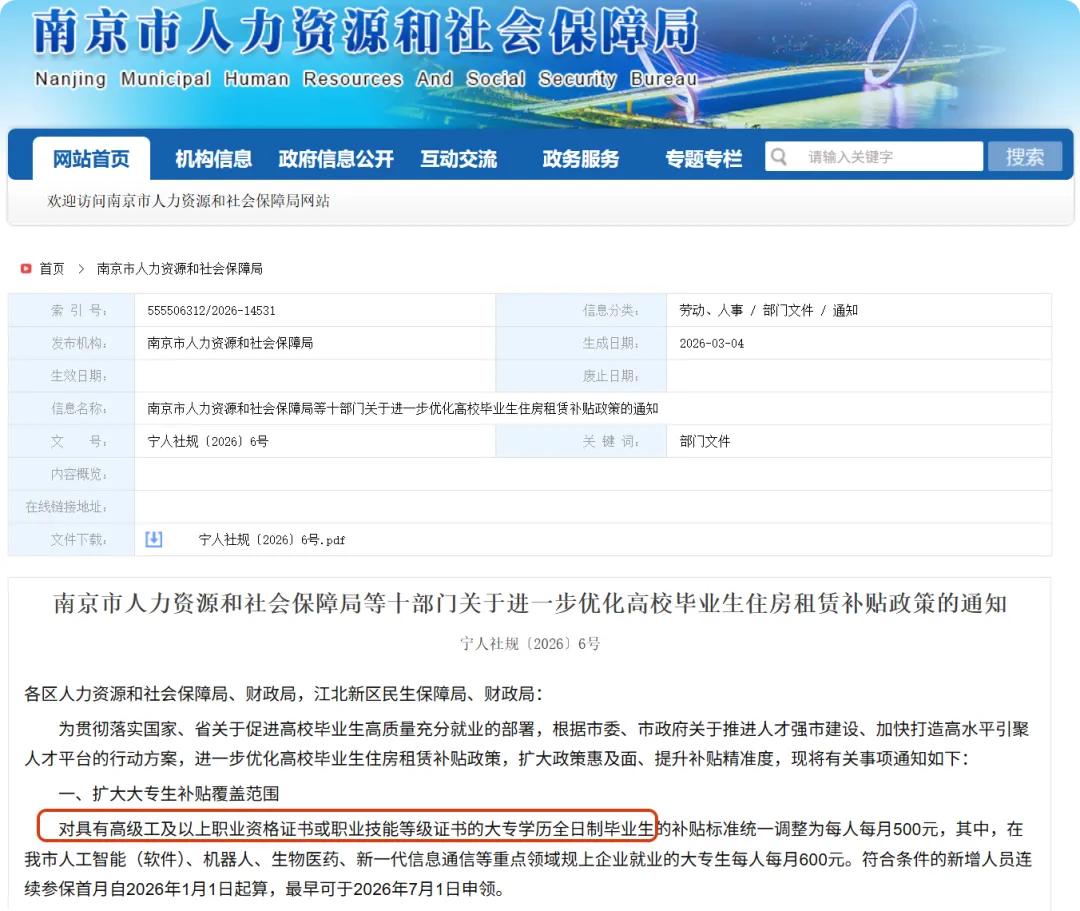 近日,南京市人力资源和社会保障局官网正式发布《南京市人力资源和社会保障局等十部门关于进一步优化高校毕业生住房租赁补贴政策的通知》(宁人社规〔2026〕6 号),该通知对全市高校毕业生住房租赁补贴政策进行了优化完善。在原有本科及以上学历人才补贴政策基础上,新增全日制大专毕业生租房补贴支持政策。