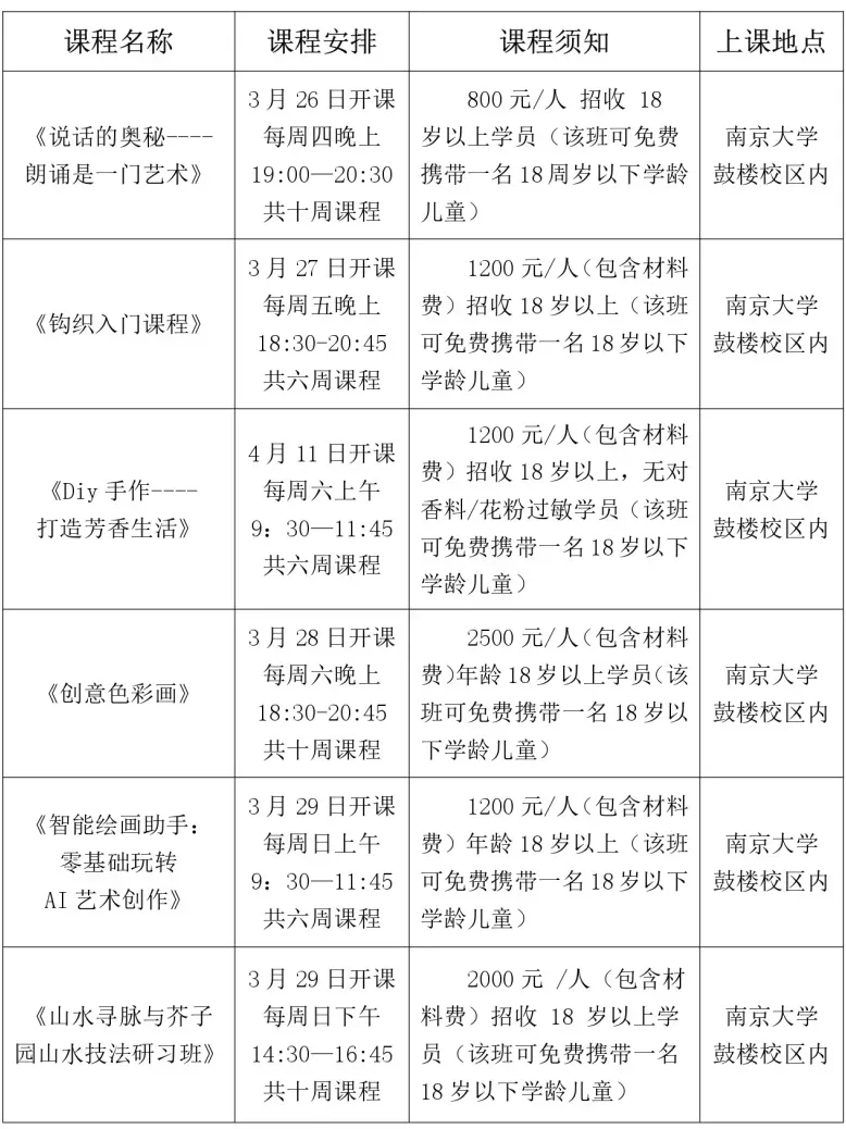 南京大学终身教育学院“艺学堂”系列课程自开办以来,凭借优质的教学、丰富的内容和温馨的氛围,赢得了良好的口碑与广泛的认可。“艺学堂”以四季更迭为灵感,寓意前来学习的学员能在南京大学这座百年学府的春樱、夏荷、秋枫、冬雪中,探寻到专属自己的艺术成长节奏。2026年春艺学堂系列课程现已开始招生,诚邀您一同踏入艺术的世界,解锁生活的多元美好!