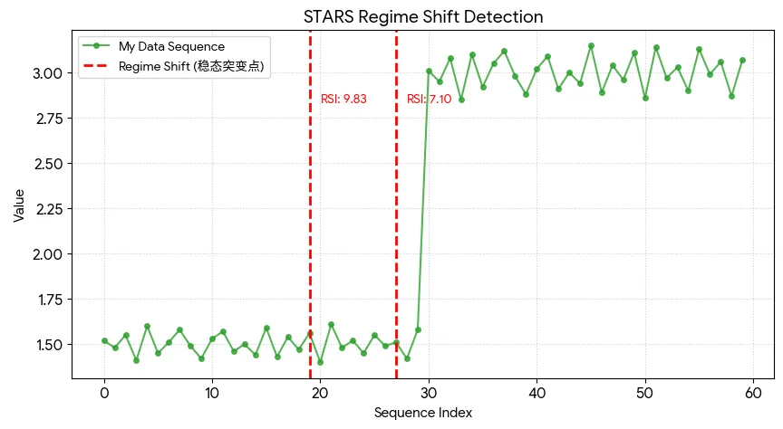 STARS 的核心逻辑是设定一个截断长度(Cut-off length, L),通过计算当前点与后续 L 个点的 T 检验,计算出情势转换指数(RSI,Regime Shift Index)。以下是精简版 Python 实现代码: