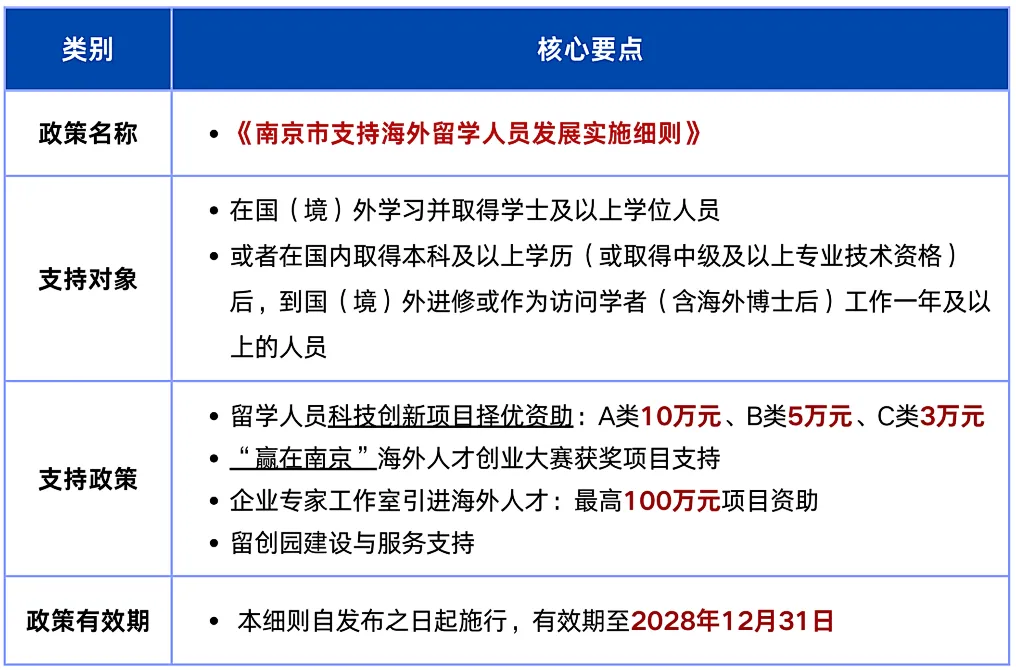 南京市人力资源和社会保障局、南京市财政局近日联合印发《南京市支持海外留学人员发展实施细则》(宁人社规〔2026〕4号),围绕海外留学人员在宁创新创业出台一系列支持措施。本细则有效期至2028年12月31日。