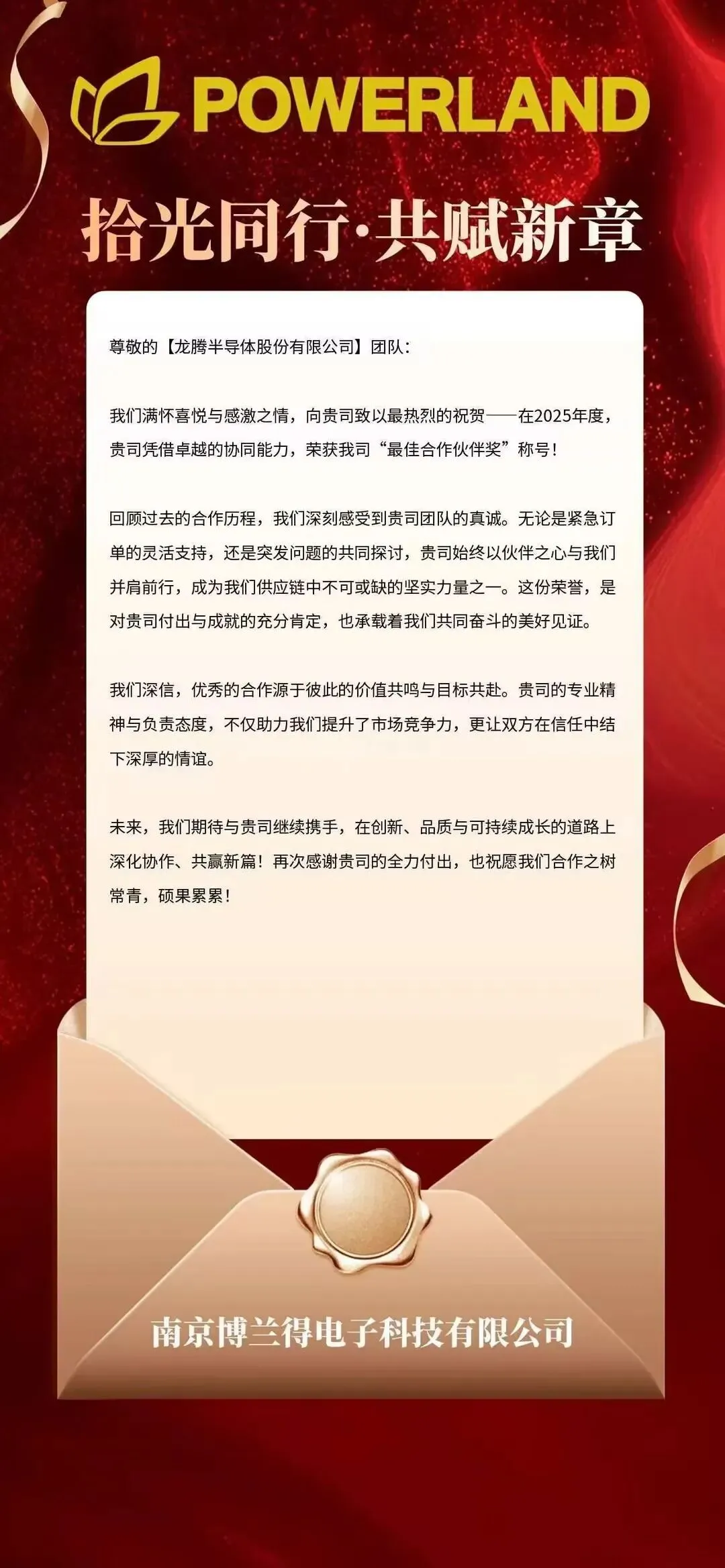 近期,龙腾半导体股份有限公司荣幸地收到来自重要客户--南京博兰得电子科技有限公司颁发的2025年度“最佳合作伙伴奖”。