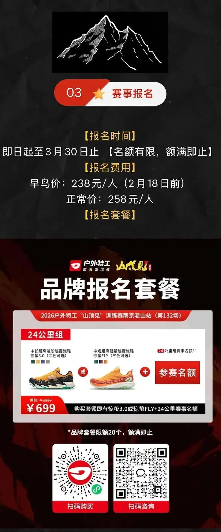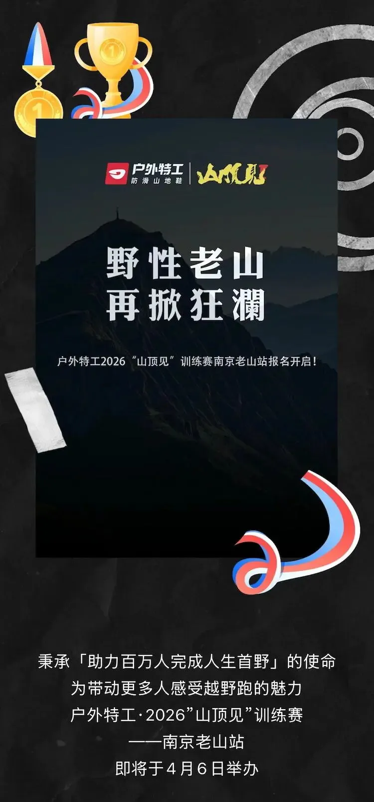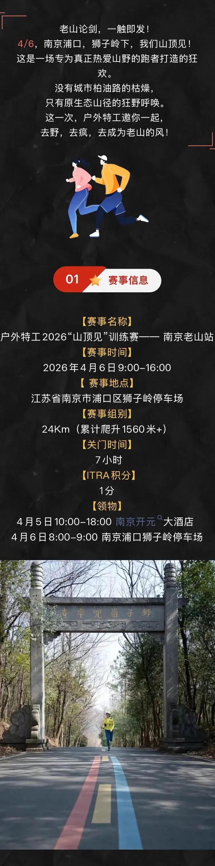 户外特工2026“山顶见”训练赛南京老山站定于4月6日9:00-16:00在江苏省南京市浦口区狮子岭停车场开赛,全程24km,累计爬升1560米+,关门时间7小时,ITRA积分1分,即日起-3月30日开放报名,先报先得,额满即止!