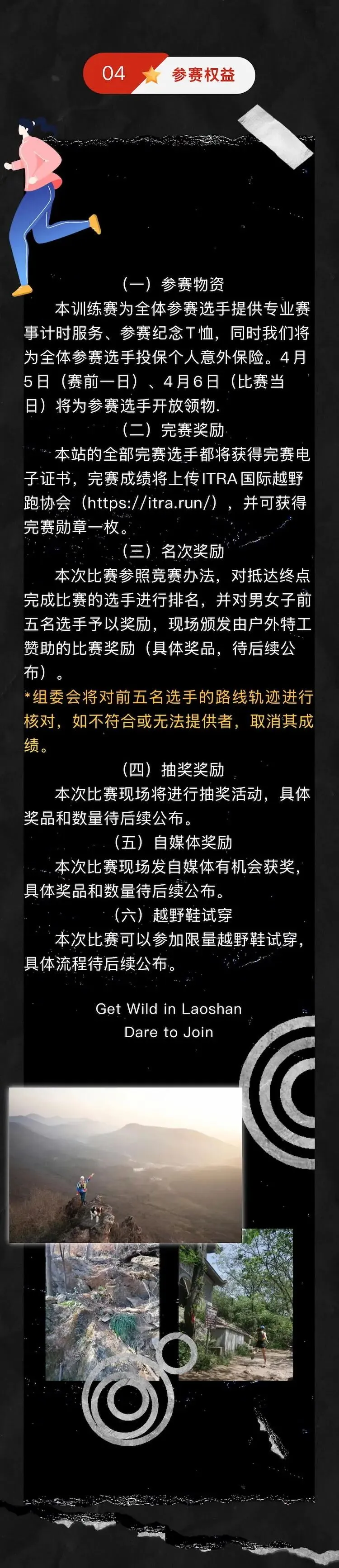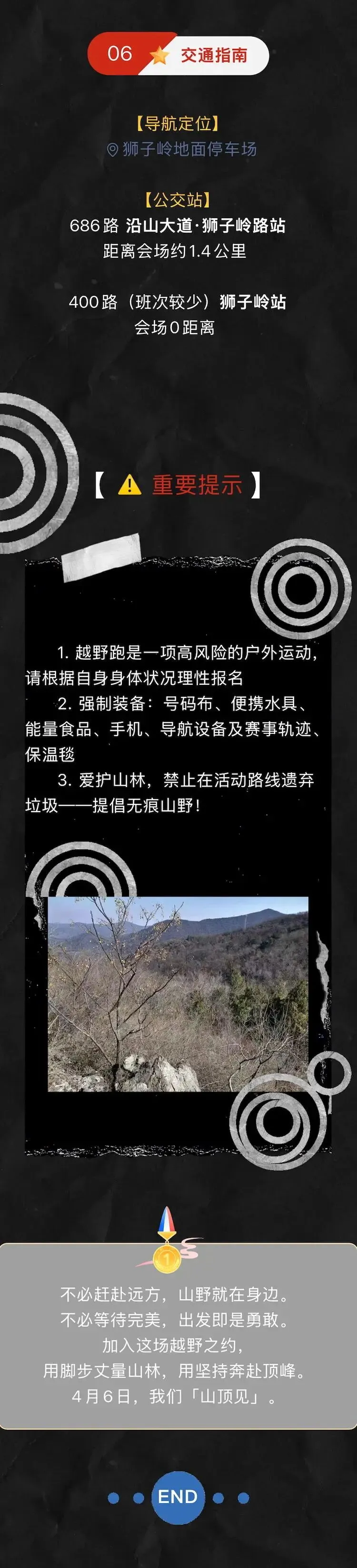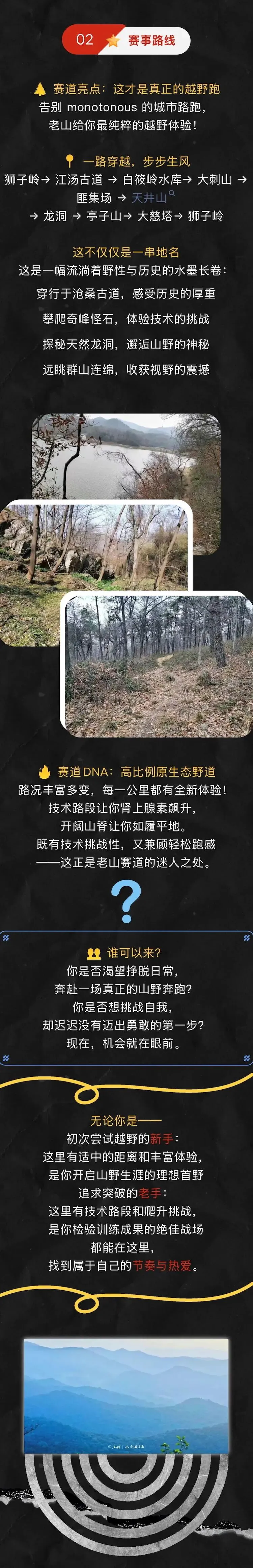 户外特工2026“山顶见”训练赛南京老山站定于4月6日9:00-16:00在江苏省南京市浦口区狮子岭停车场开赛,全程24km,累计爬升1560米+,关门时间7小时,ITRA积分1分,即日起-3月30日开放报名,先报先得,额满即止!