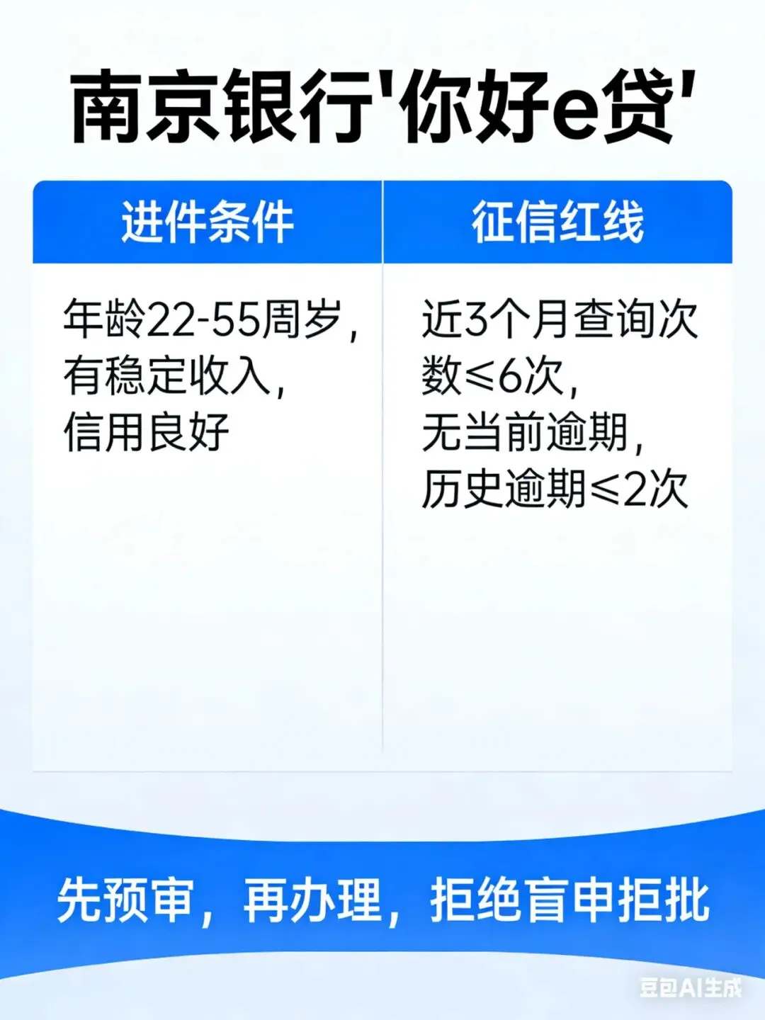 想办南京银行你好e贷,怕盲申踩雷、浪费征信查询?这份官方核心进件标准+征信红线,帮你快速自测匹配度。