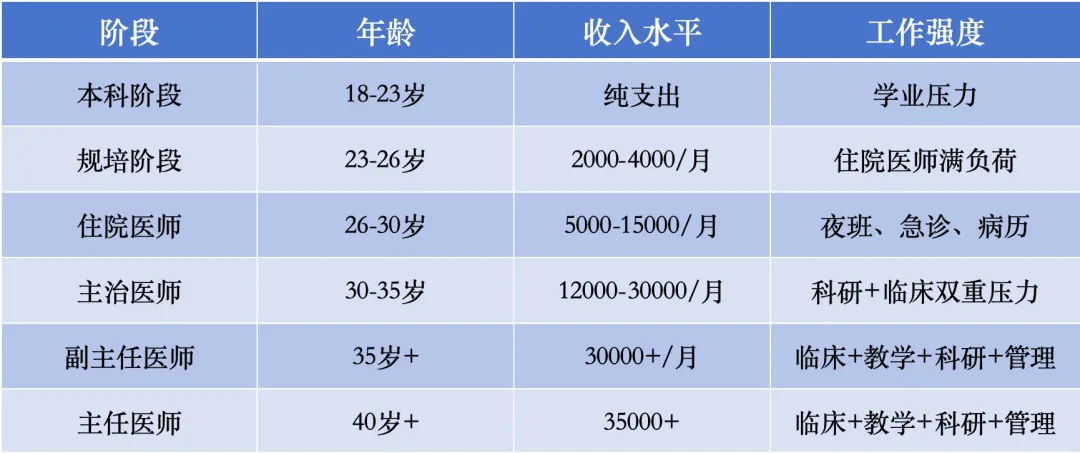 - 本科5年,规培3年(收入微薄),专培2-4年(部分专科要求),考研/申博(竞争激烈)。从入学到独立执业,至少10-12年。