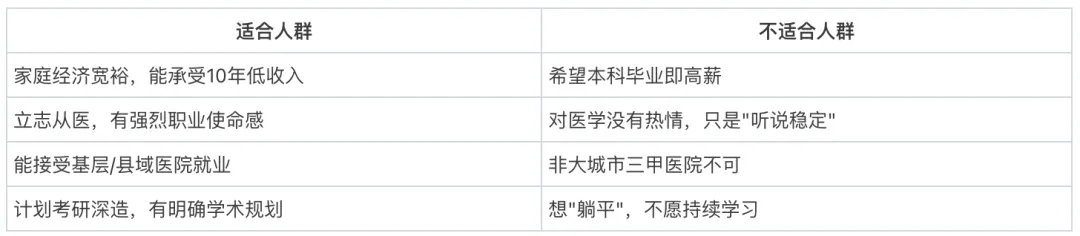 如果你考虑公卫/基础/药学:不要冲着"医学"二字报考,这些专业与临床医生职业路径完全不同。适合对特定领域有明确兴趣的学生。