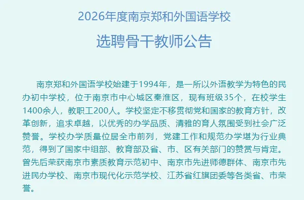 当前位置:首页>南京>南京教师招聘||2026年南京郑和外国语学校选聘骨干教师公告