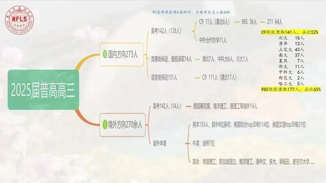 2025届高三共有273名同学通过竞赛类保送和提前录取、语言类保送、高考被国内高校录取。其中,北大18人,清华12人,上海交大43人,南大37人,复旦7人,浙大11人,中科大6人,西安交大2人,哈工大5人。