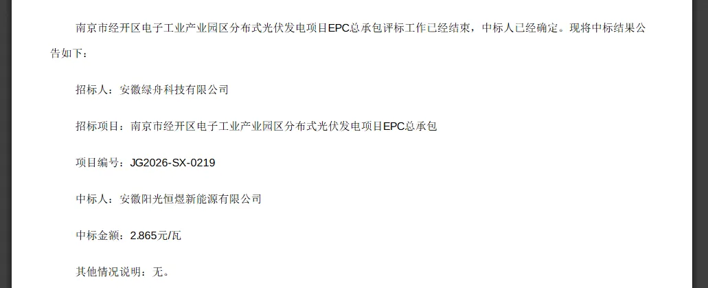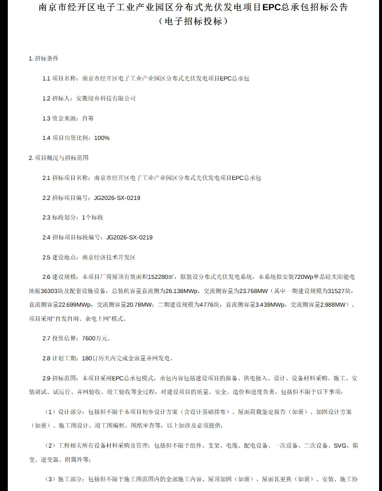 近日,南京市经开区电子工业产业园区分布式光伏发电项目EPC总承包总承包中标结果。