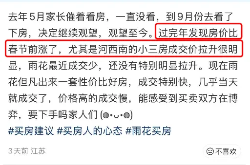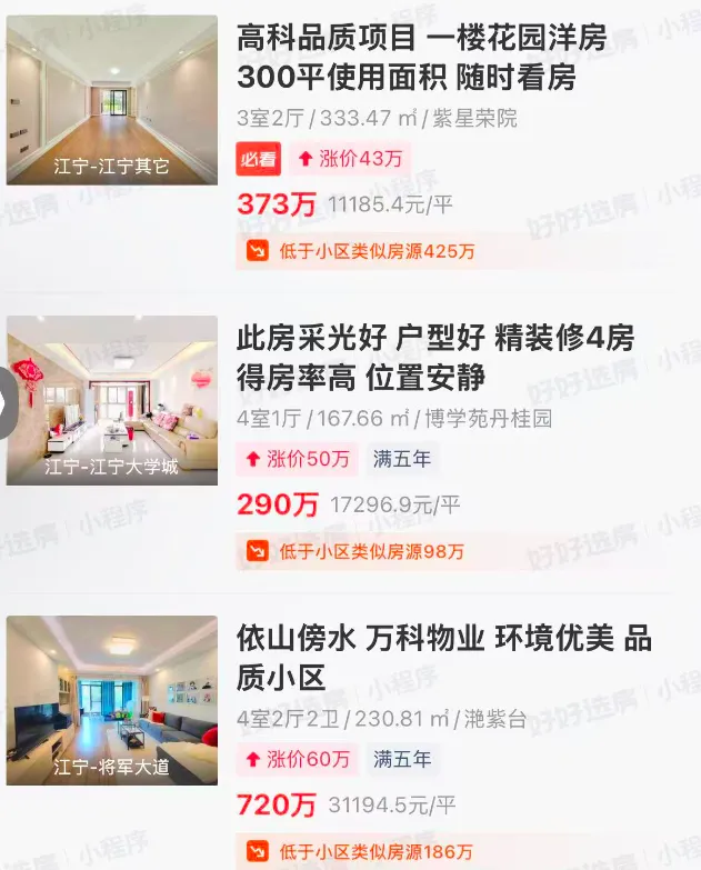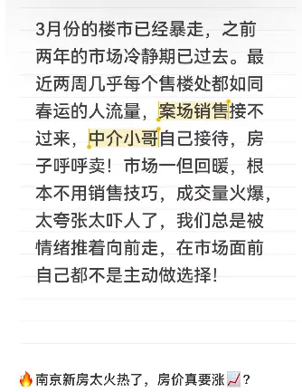 要说南京今年突然启动小阳春,其实很多人并不意外,早在去年下半年就有很多专家直接放话,看好2026中国楼市,看好南京。目前,南京房价已经从2021年的高点经历了长达5年的调整,部分板块房价明显超跌,租售比不断提高。以至于在去年还吸引了大批上海人来抄底投资。超跌之后,价值必定修复,一旦预期扭转,核心区域价格反弹会非常容易,今年小阳春行情就是修复的表现。此外,今年3月南京楼市如此火爆,还有一个原因就是大量家长购置学区房的需求集中释放,因此,像鼓楼学区房、河西奥体等板块房价也有一个明显的提升。并且,开年的人才新政也直接刺激了大量改善需求,一些高学历家庭买房直接能省下几十万,新房性价比更加凸显。虽说目前的确有一些房东在涨价卖房,也有一些楼盘的确成交价涨了。但目前南京房价依然很有性价比,低价房源仍有不少,捡漏机会很多。最后,也希望今年更多朋友能够买到心仪房源,拥有美好生活!