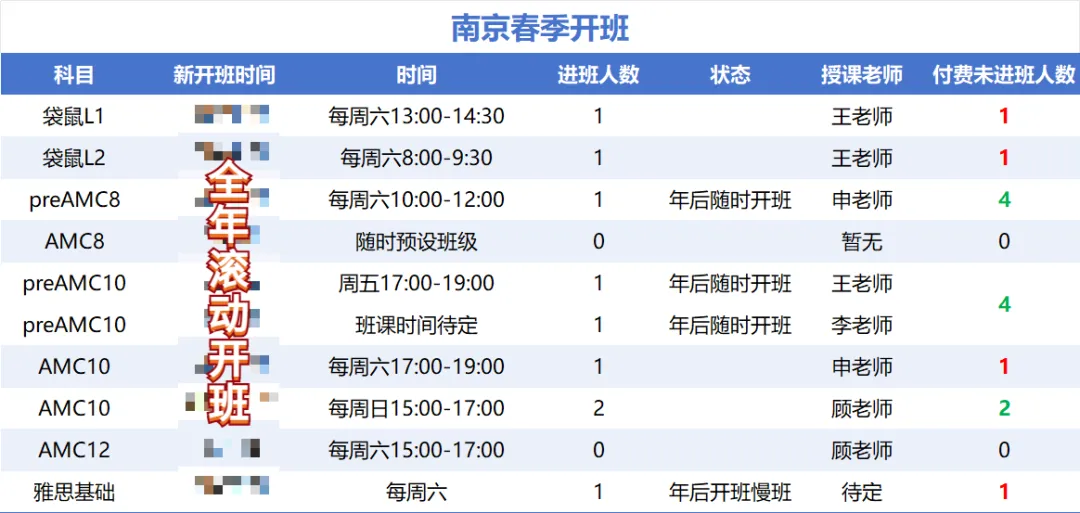 每位老师固定负责特定层级:王老师主攻袋鼠和PreAMC10基础段,申老师负责AMC8/10进阶,顾老师专注AMC10/12高阶和已开班课程,李老师补充PreAMC10时段。分工明确,教学连贯。
