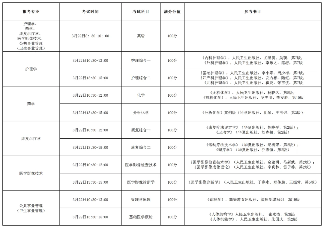 各专业考试科目、考试内容及要求详见下表: