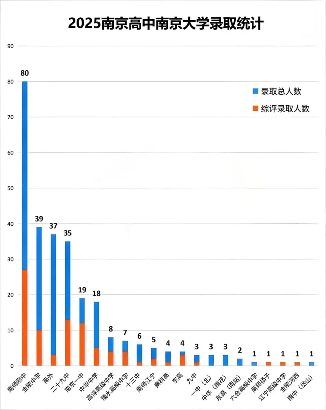 南师附中以80人领跑全省,金中、南外、二十九中录取人数均超30人。2025南京大学在南京录取情况: