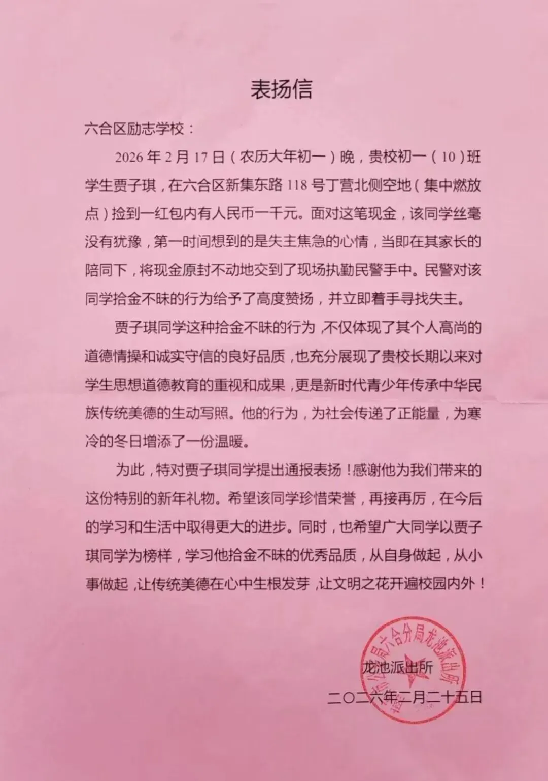 龙池派出所副所长王亚伟表示,贾子琪同学拾金不昧的行为不仅体现了个人高尚的道德情操和诚实守信的良好品质,也充分展现了南京市六合区励志学校长期以来对学生思想道德教育的重视和成果,更是新时代青少年传承中华民族传统美德的生动写照。