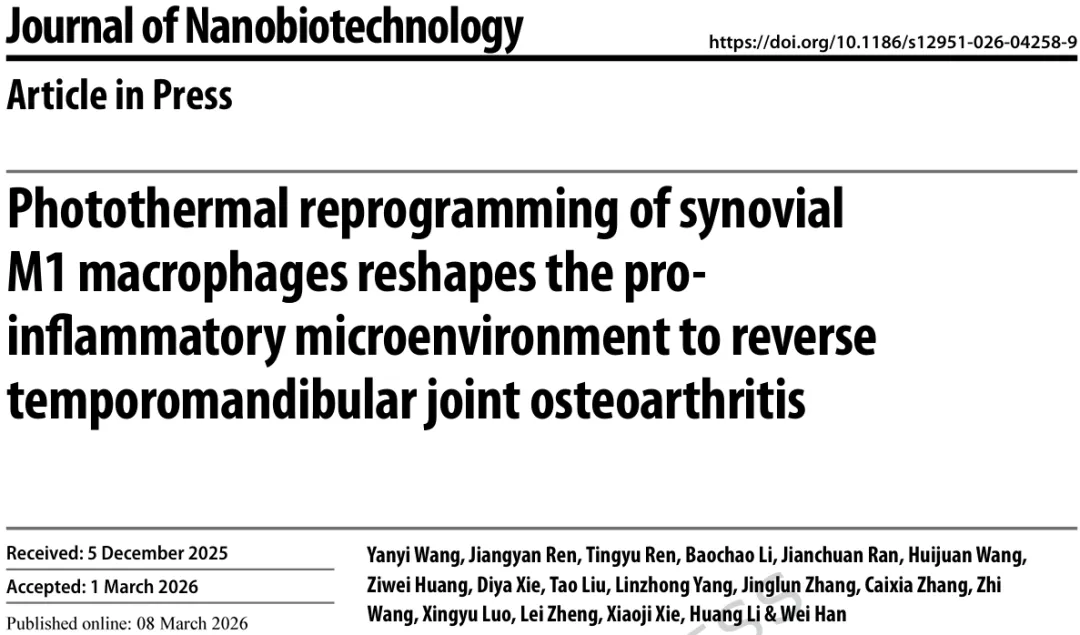 今天,分享一篇南京大学医学院附属口腔医院韩伟教授、李煌教授团队的最新研究文章:Photothermal Title Page Reprogramming of Synovial M1 Macrophages Reshapes the Pro-inflammatory Microenvironment to Reverse Temporomandibular Osteoarthritis(光热重编程滑膜M1巨噬细胞重塑促炎微环境以逆转颞下颌骨关节炎)。