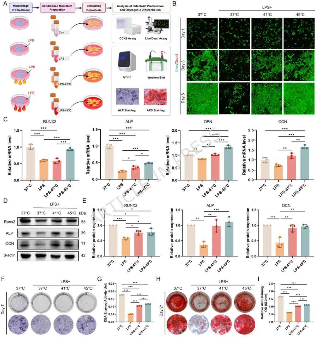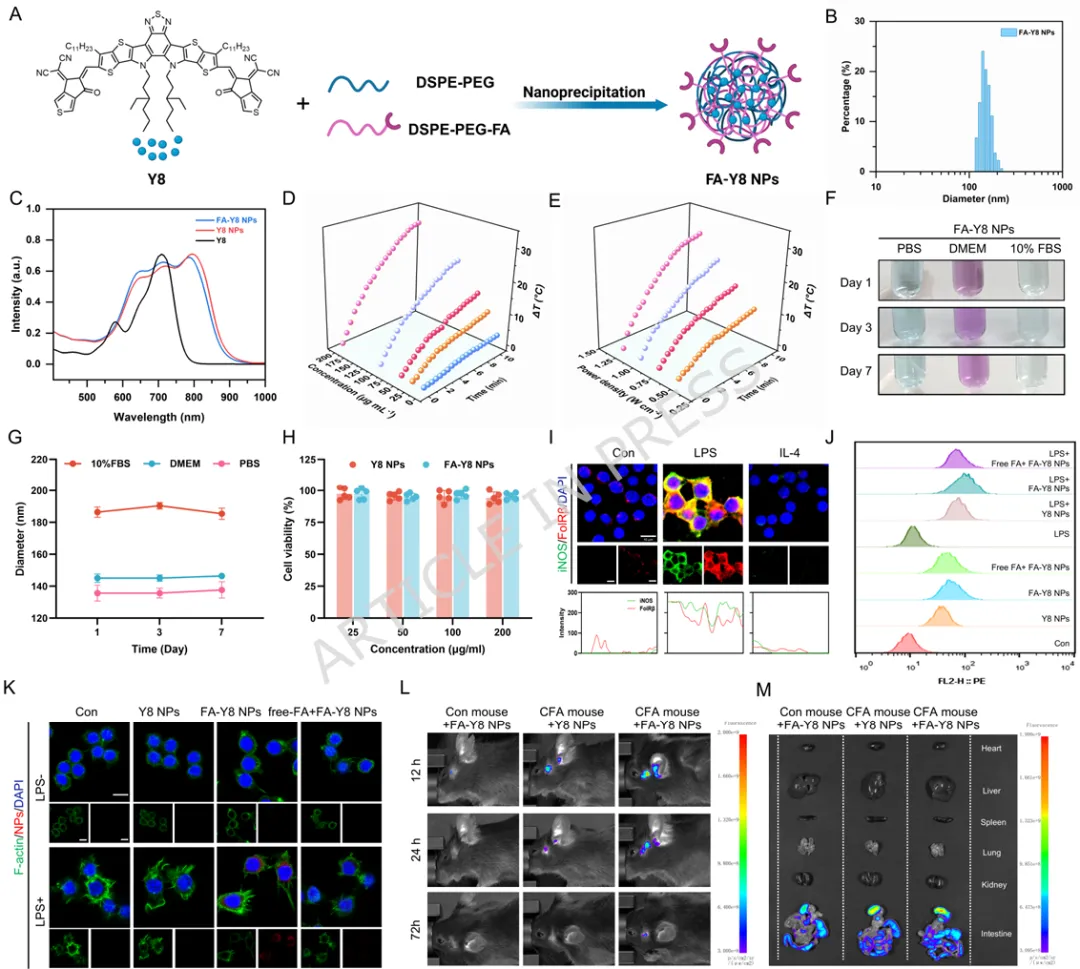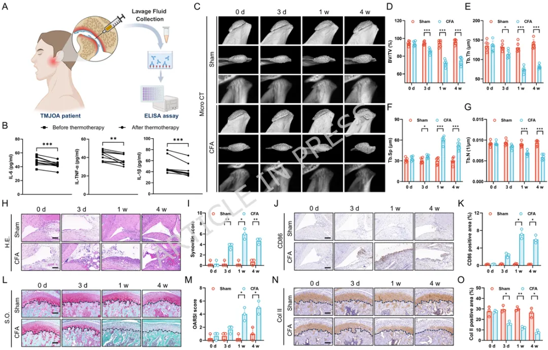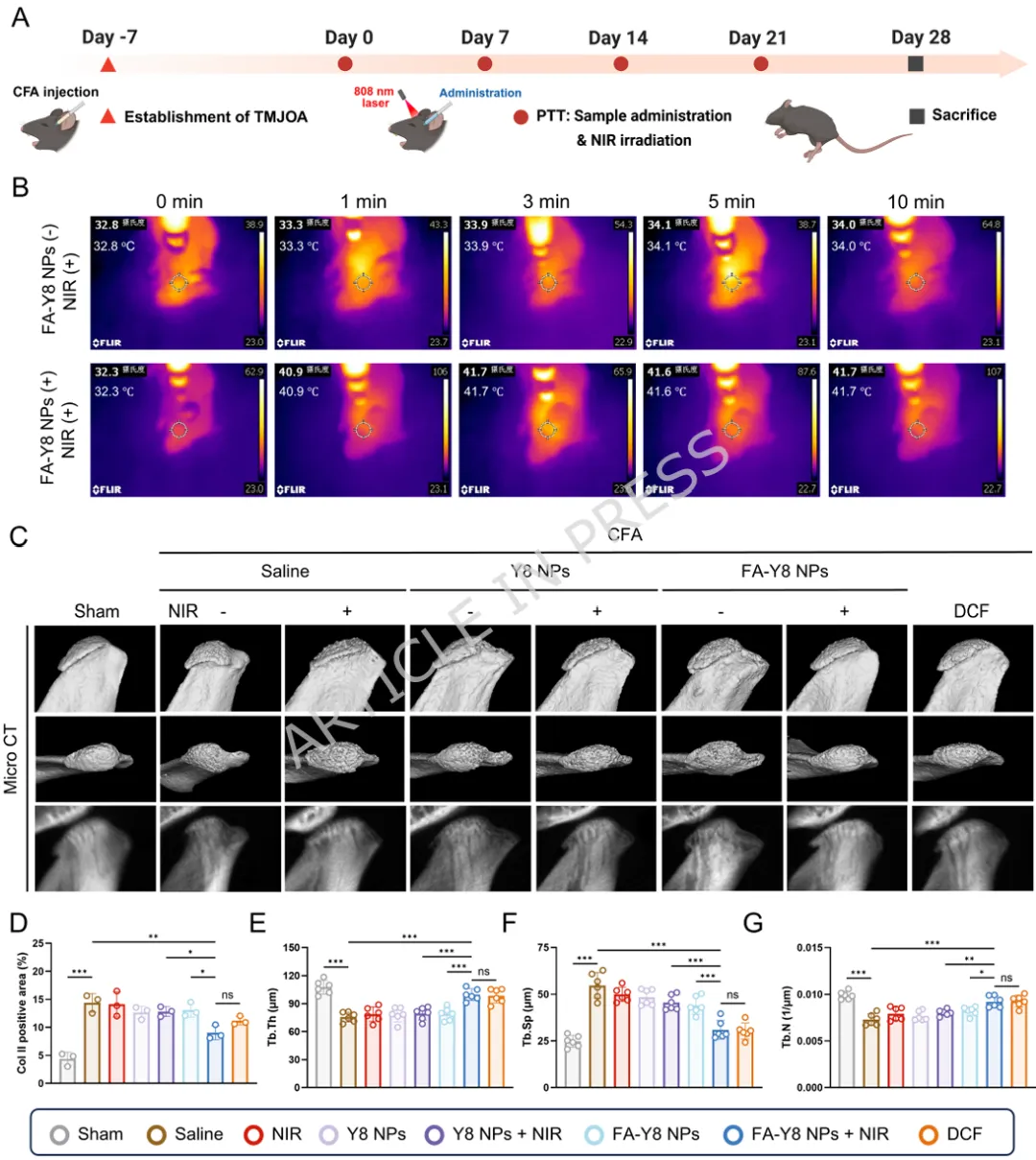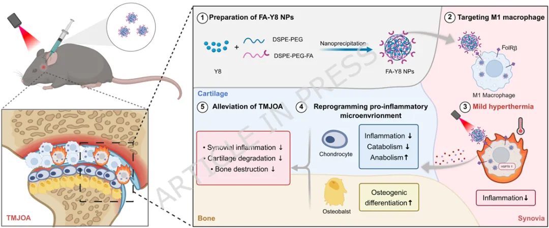 1️⃣ 首次揭示温和热刺激可通过HSP70-NF-κB通路重编程滑膜M1巨噬细胞。2️⃣ 构建叶酸靶向FA-Y8光热纳米平台,实现炎症滑膜M1巨噬细胞精准靶向。3️⃣ 温和光热刺激(41℃)可重塑巨噬细胞分泌谱,抑制软骨分解并促进骨形成。4️⃣ 在TMJOA小鼠模型中,该光热免疫调控策略显著缓解滑膜炎并保护软骨结构。5️⃣ 提出一种从“热疗止痛”到“免疫微环境重塑”的骨关节炎治疗新机制。颞下颌关节骨关节炎(Temporomandibular Joint Osteoarthritis,TMJOA)是一种常见的退行性关节疾病,其主要病理特征包括滑膜炎症、软骨降解以及软骨下骨结构破坏。流行病学研究显示,该疾病在30岁以下人群中的患病率约为14.6%,而在30–80岁人群中可高达28%–32%。随着疾病进展,患者常出现持续性疼痛、张口受限及咀嚼功能障碍,严重影响生活质量。目前临床治疗主要依赖非甾体抗炎药、物理治疗以及手术干预等方式。然而药物治疗往往只能缓解症状,长期使用还可能产生系统性副作用;而手术治疗则创伤大、费用高且不可逆。因此,开发能够从病理机制层面逆转关节炎症及组织退变的新型治疗策略成为该领域的重要研究方向。近年来研究发现,滑膜巨噬细胞在TMJOA炎症进展中发挥关键作用。尤其是促炎型M1巨噬细胞大量浸润滑膜组织后,会分泌TNF-α、IL-6、IL-1β等炎症因子,诱导软骨细胞分解代谢并加速关节退变。因此,调控M1/M2巨噬细胞极化平衡被认为是一种具有潜力的免疫治疗策略。本研究首先通过临床样本分析发现,接受热疗的TMJOA患者滑液中炎症因子(IL-6、IL-1β、TNF-α)明显降低,提示热刺激可能具有抗炎作用。进一步实验表明,温和高温(约41℃)能够通过诱导HSP70表达并抑制NF-κB信号通路,从而显著降低M1巨噬细胞炎症反应。在此基础上,作者设计了一种叶酸靶向光热纳米材料FA-Y8 NPs。该纳米平台能够识别M1巨噬细胞表面的叶酸受体β(FolRβ),从而实现炎症滑膜巨噬细胞的精准靶向。当纳米颗粒在近红外光(808 nm)照射下时,可产生局部温和热效应,实现对巨噬细胞炎症表型的重编程。作者进一步发现,经热调控后的巨噬细胞分泌谱发生显著变化,其条件培养基不仅能够抑制软骨细胞炎症和分解代谢,还能促进成骨细胞矿化能力,从而在多层面改善关节微环境。在CFA诱导的TMJOA小鼠模型中,FA-Y8光热治疗能够显著减少滑膜炎症细胞浸润,降低M1巨噬细胞比例,同时改善软骨退变和软骨下骨结构破坏。整体疗效与临床常用NSAIDs药物相当,但具有更高的靶向性和更低的系统副作用。FA-Y8纳米粒子的构建及其针对TMJOA的靶向光热治疗示意图作者首先收集10例TMJOA患者的关节滑液,并比较热疗前后的炎症因子变化。ELISA检测结果显示,热疗显著降低IL-6、IL-1β和TNF-α水平,说明热刺激能够缓解关节炎症反应。同时在CFA诱导的TMJOA小鼠模型中,通过micro-CT及组织学染色发现滑膜炎症伴随软骨退变及骨结构改变,进一步验证了滑膜炎症在疾病发生中的关键作用。Figure 1、滑膜中的M1型巨噬细胞是CFA诱导的TMJOA的关键驱动因素。(A) TMJOA患者滑膜灌洗液采集与分析示意图。(B) 人TMJOA患者滑膜灌洗液中IL-1β、TNF-α和IL-6的浓度。(C) TMJ髁突的显微CT图像。第1、4行:三维图像矢状面;第2、5行:三维图像水平面;第3、6行:二维图像矢状面。(D-G) 基于显微CT图像对TMJ髁突软骨下骨的BV/TV、Tb.Sp、Tb.Th和Tb.N的定量分析。(H) 关节滑膜H.E.染色的代表性图像。(I) TMJ滑膜炎评分的定量分析。(J) 滑膜区CD86免疫组化染色的代表性图像。(K) CD86表达的定量分析。(L) 关节软骨区S.O.染色的代表性图像。(M) OARIS评分的定量分析。(O) 关节软骨Col II免疫组化染色的代表性图像。(P) Col II表达的定量分析。为探索热疗的免疫机制,作者对LPS诱导的M1巨噬细胞进行不同温度刺激。结果显示,41℃温和热刺激能够显著降低炎症基因表达,同时维持细胞活性;而45℃高温则导致明显细胞毒性。RNA-seq及Western blot结果表明,温和热刺激通过诱导HSP70表达并抑制NF-κB信号通路,从而实现对M1巨噬细胞炎症反应的调控。Figure 2、热疗可减轻巨噬细胞的炎症反应及其潜在机制。(A) 不同温度处理对巨噬细胞增殖及炎症反应影响与机制的实验设计示意图。(B) 按所示条件处理后巨噬细胞活/死染色的代表性图像。(C) 按所示条件处理后巨噬细胞中炎症基因(Nos2、TNF-α、IL-6)mRNA的qPCR分析。(D) 按所示条件刺激后,巨噬细胞培养上清中IL-6和TNF-α的ELISA分析。(E-F) 按所示条件处理后巨噬细胞中M1型巨噬细胞标志物(CD86)及炎症蛋白(iNOS、TNF-α、IL-6)的WB及定量分析。(G) 与LPS组相比,LPS-41°C组上调和下调通路的KEGG分析。(H) 与LPS组相比,LPS-45°C组上调和下调通路的KEGG分析。(I) 按所示条件处理后巨噬细胞中HSP70、磷酸化NF-κB及NF-κB的WB分析作者进一步收集不同条件下巨噬细胞的培养上清,并作用于软骨细胞。结果发现,炎症巨噬细胞上清会显著抑制软骨细胞增殖并促进MMP13等分解代谢基因表达,而热处理后的巨噬细胞上清则能够恢复Col2a1与SOX9表达,并减少软骨基质降解,从而发挥明显的软骨保护作用。Figure 3、巨噬细胞热处理可减轻软骨细胞的炎症损伤。(A) 收集不同巨噬细胞条件培养基并与DMEM完全培养基(CCM)混合用于软骨细胞培养及功能分析的实验设计示意图。(B) 软骨细胞与不同CCM共培养后的活/死染色代表性图像。(C) 软骨细胞与不同CCM共培养后的EdU掺入实验。(D) 用不同CCM培养的软