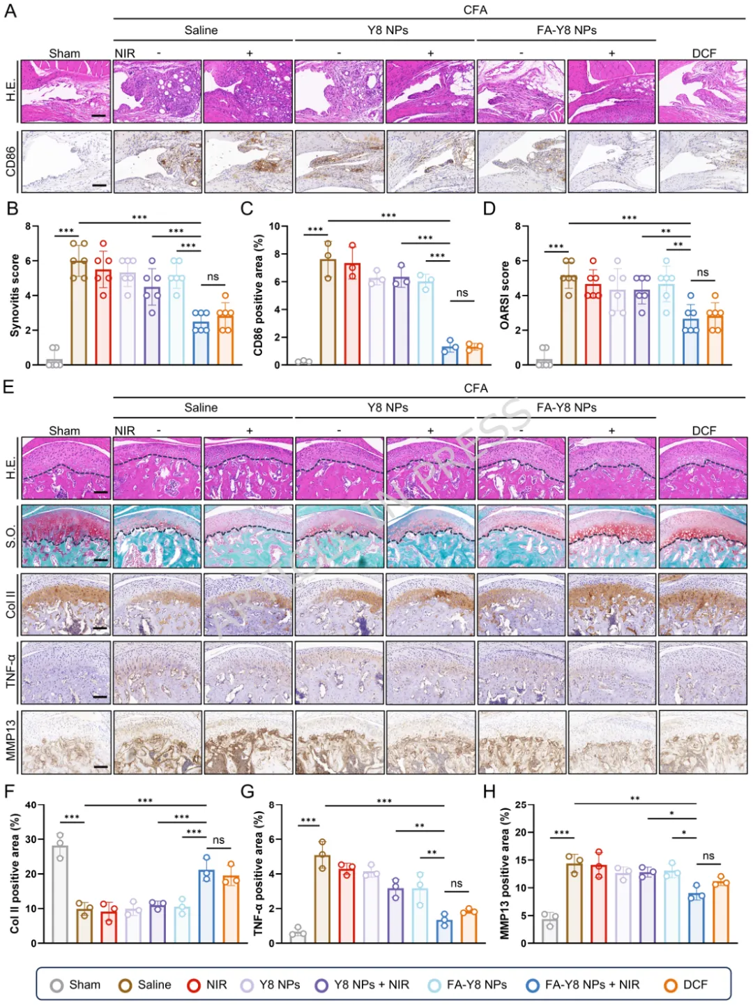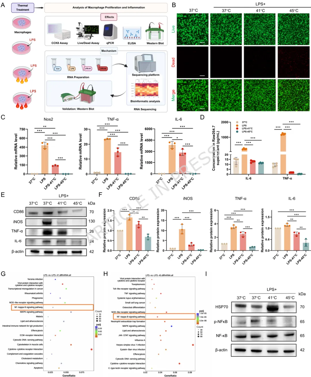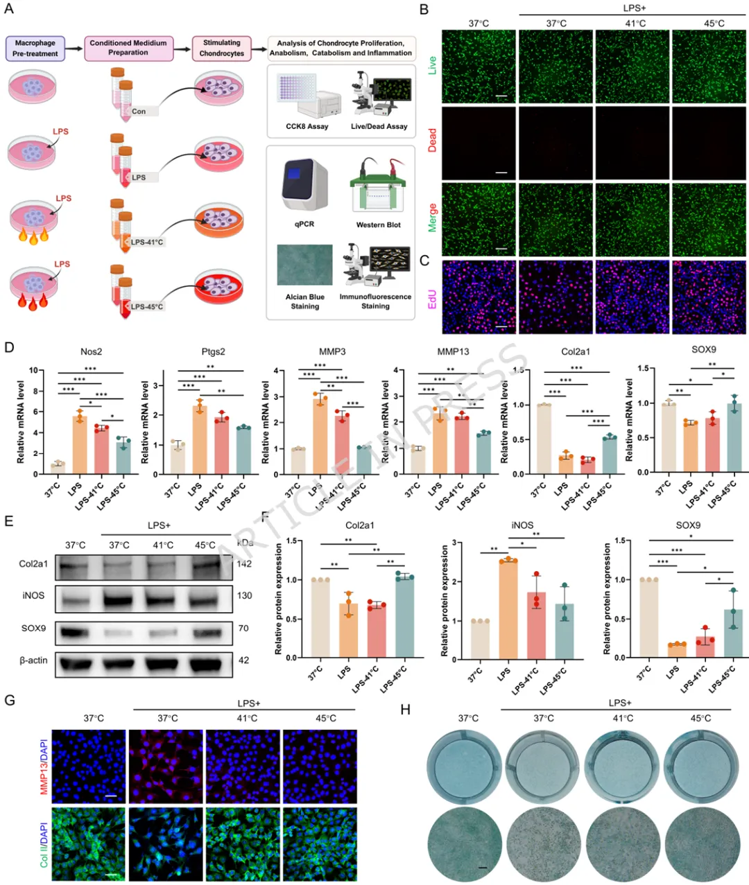 1️⃣ 首次揭示温和热刺激可通过HSP70-NF-κB通路重编程滑膜M1巨噬细胞。2️⃣ 构建叶酸靶向FA-Y8光热纳米平台,实现炎症滑膜M1巨噬细胞精准靶向。3️⃣ 温和光热刺激(41℃)可重塑巨噬细胞分泌谱,抑制软骨分解并促进骨形成。4️⃣ 在TMJOA小鼠模型中,该光热免疫调控策略显著缓解滑膜炎并保护软骨结构。5️⃣ 提出一种从“热疗止痛”到“免疫微环境重塑”的骨关节炎治疗新机制。颞下颌关节骨关节炎(Temporomandibular Joint Osteoarthritis,TMJOA)是一种常见的退行性关节疾病,其主要病理特征包括滑膜炎症、软骨降解以及软骨下骨结构破坏。流行病学研究显示,该疾病在30岁以下人群中的患病率约为14.6%,而在30–80岁人群中可高达28%–32%。随着疾病进展,患者常出现持续性疼痛、张口受限及咀嚼功能障碍,严重影响生活质量。目前临床治疗主要依赖非甾体抗炎药、物理治疗以及手术干预等方式。然而药物治疗往往只能缓解症状,长期使用还可能产生系统性副作用;而手术治疗则创伤大、费用高且不可逆。因此,开发能够从病理机制层面逆转关节炎症及组织退变的新型治疗策略成为该领域的重要研究方向。近年来研究发现,滑膜巨噬细胞在TMJOA炎症进展中发挥关键作用。尤其是促炎型M1巨噬细胞大量浸润滑膜组织后,会分泌TNF-α、IL-6、IL-1β等炎症因子,诱导软骨细胞分解代谢并加速关节退变。因此,调控M1/M2巨噬细胞极化平衡被认为是一种具有潜力的免疫治疗策略。本研究首先通过临床样本分析发现,接受热疗的TMJOA患者滑液中炎症因子(IL-6、IL-1β、TNF-α)明显降低,提示热刺激可能具有抗炎作用。进一步实验表明,温和高温(约41℃)能够通过诱导HSP70表达并抑制NF-κB信号通路,从而显著降低M1巨噬细胞炎症反应。在此基础上,作者设计了一种叶酸靶向光热纳米材料FA-Y8 NPs。该纳米平台能够识别M1巨噬细胞表面的叶酸受体β(FolRβ),从而实现炎症滑膜巨噬细胞的精准靶向。当纳米颗粒在近红外光(808 nm)照射下时,可产生局部温和热效应,实现对巨噬细胞炎症表型的重编程。作者进一步发现,经热调控后的巨噬细胞分泌谱发生显著变化,其条件培养基不仅能够抑制软骨细胞炎症和分解代谢,还能促进成骨细胞矿化能力,从而在多层面改善关节微环境。在CFA诱导的TMJOA小鼠模型中,FA-Y8光热治疗能够显著减少滑膜炎症细胞浸润,降低M1巨噬细胞比例,同时改善软骨退变和软骨下骨结构破坏。整体疗效与临床常用NSAIDs药物相当,但具有更高的靶向性和更低的系统副作用。FA-Y8纳米粒子的构建及其针对TMJOA的靶向光热治疗示意图作者首先收集10例TMJOA患者的关节滑液,并比较热疗前后的炎症因子变化。ELISA检测结果显示,热疗显著降低IL-6、IL-1β和TNF-α水平,说明热刺激能够缓解关节炎症反应。同时在CFA诱导的TMJOA小鼠模型中,通过micro-CT及组织学染色发现滑膜炎症伴随软骨退变及骨结构改变,进一步验证了滑膜炎症在疾病发生中的关键作用。Figure 1、滑膜中的M1型巨噬细胞是CFA诱导的TMJOA的关键驱动因素。(A) TMJOA患者滑膜灌洗液采集与分析示意图。(B) 人TMJOA患者滑膜灌洗液中IL-1β、TNF-α和IL-6的浓度。(C) TMJ髁突的显微CT图像。第1、4行:三维图像矢状面;第2、5行:三维图像水平面;第3、6行:二维图像矢状面。(D-G) 基于显微CT图像对TMJ髁突软骨下骨的BV/TV、Tb.Sp、Tb.Th和Tb.N的定量分析。(H) 关节滑膜H.E.染色的代表性图像。(I) TMJ滑膜炎评分的定量分析。(J) 滑膜区CD86免疫组化染色的代表性图像。(K) CD86表达的定量分析。(L) 关节软骨区S.O.染色的代表性图像。(M) OARIS评分的定量分析。(O) 关节软骨Col II免疫组化染色的代表性图像。(P) Col II表达的定量分析。为探索热疗的免疫机制,作者对LPS诱导的M1巨噬细胞进行不同温度刺激。结果显示,41℃温和热刺激能够显著降低炎症基因表达,同时维持细胞活性;而45℃高温则导致明显细胞毒性。RNA-seq及Western blot结果表明,温和热刺激通过诱导HSP70表达并抑制NF-κB信号通路,从而实现对M1巨噬细胞炎症反应的调控。Figure 2、热疗可减轻巨噬细胞的炎症反应及其潜在机制。(A) 不同温度处理对巨噬细胞增殖及炎症反应影响与机制的实验设计示意图。(B) 按所示条件处理后巨噬细胞活/死染色的代表性图像。(C) 按所示条件处理后巨噬细胞中炎症基因(Nos2、TNF-α、IL-6)mRNA的qPCR分析。(D) 按所示条件刺激后,巨噬细胞培养上清中IL-6和TNF-α的ELISA分析。(E-F) 按所示条件处理后巨噬细胞中M1型巨噬细胞标志物(CD86)及炎症蛋白(iNOS、TNF-α、IL-6)的WB及定量分析。(G) 与LPS组相比,LPS-41°C组上调和下调通路的KEGG分析。(H) 与LPS组相比,LPS-45°C组上调和下调通路的KEGG分析。(I) 按所示条件处理后巨噬细胞中HSP70、磷酸化NF-κB及NF-κB的WB分析作者进一步收集不同条件下巨噬细胞的培养上清,并作用于软骨细胞。结果发现,炎症巨噬细胞上清会显著抑制软骨细胞增殖并促进MMP13等分解代谢基因表达,而热处理后的巨噬细胞上清则能够恢复Col2a1与SOX9表达,并减少软骨基质降解,从而发挥明显的软骨保护作用。Figure 3、巨噬细胞热处理可减轻软骨细胞的炎症损伤。(A) 收集不同巨噬细胞条件培养基并与DMEM完全培养基(CCM)混合用于软骨细胞培养及功能分析的实验设计示意图。(B) 软骨细胞与不同CCM共培养后的活/死染色代表性图像。(C) 软骨细胞与不同CCM共培养后的EdU掺入实验。(D) 用不同CCM培养的软