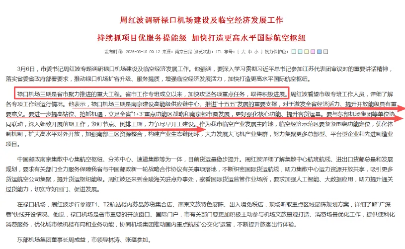 值得一提的是,市领导表示:对于禄口机场三期,需要“紧盯节点、倒排工期,力争尽早开工建设”。