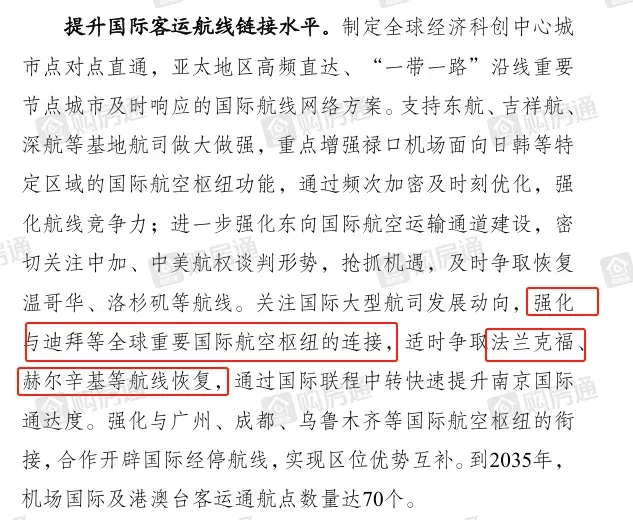 除了机场扩容外,禄口机场的航线也在未来十年开启增加模式:比如法兰克福、赫尔辛基等,计划10年内实现70个国际或港澳台客运通航点数,是目前通航点数的3倍以上(截至2024年5月底,南京禄口国际机场的国际及港澳台客运航点共22个)。