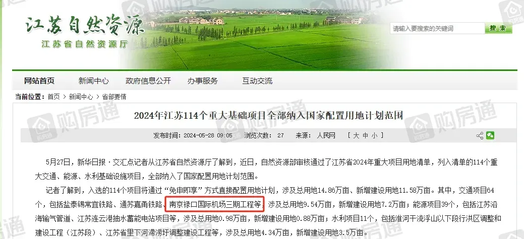 今年5月,自然资源部审核通过了江苏省2024年重大项目用地清单,其中,交通项目64个,就被包括了南京禄口国际机场三期工程!