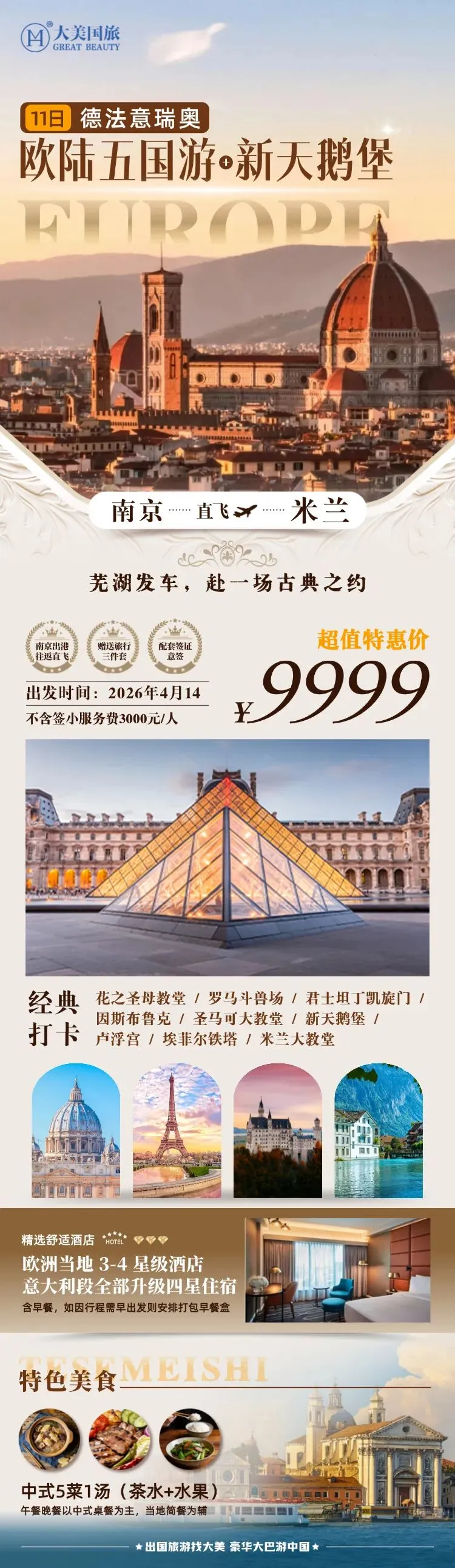 想要一次性打卡时尚巴黎、宁静瑞士、热情意大利,那么这条线路简直是为你量身定做!4月14日,芜湖发车,南京直飞米兰,