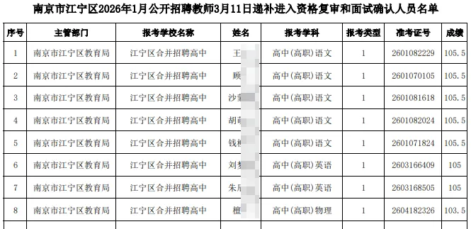 南京市江宁区2026年1月公开招聘教师3月11日递补进入资格复审和面试确认人员名单公示