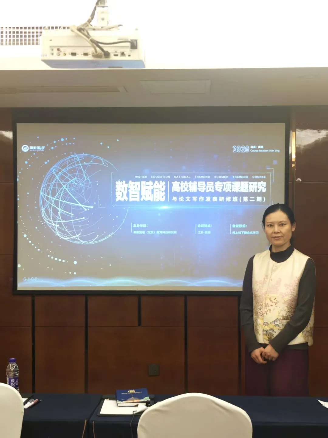 为进一步提升辅导员队伍的数智素养与科研能力,探索新时代学生工作的创新路径,1月30日至2月4日,我院选派辅导员吕玉娟老师赴南京参加了由高教国培(北京)教育科技研究院主办的“数智赋能高校辅导员专项课题研究与论文写作发表研修班(第二期)”。为期六天的系统学习,为我院学生工作与科学研究的深度融合注入了新动能。