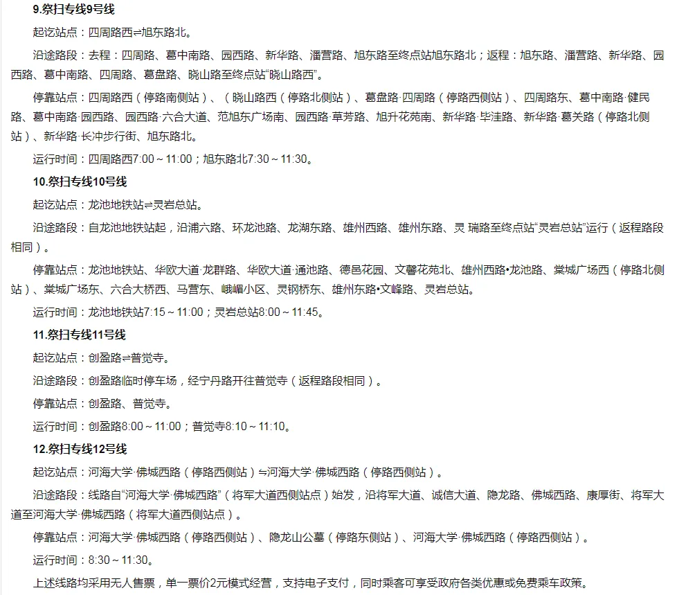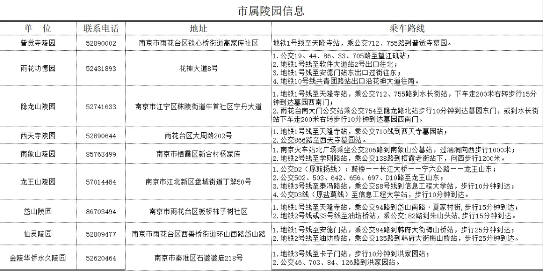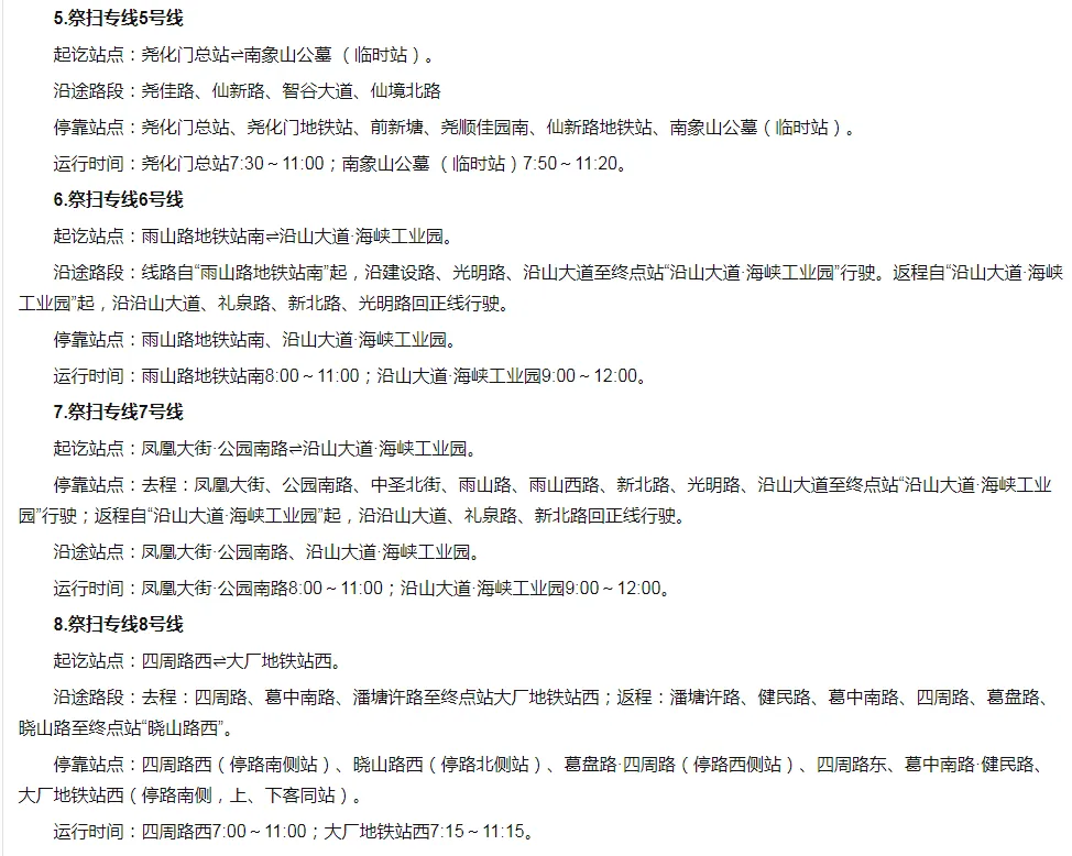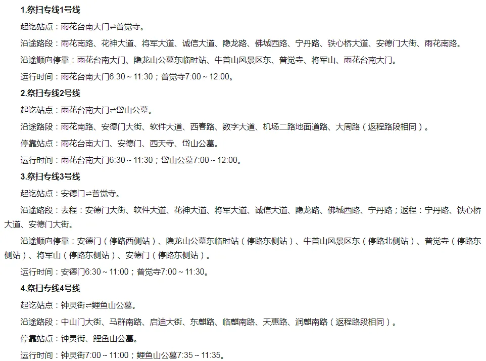 专线开通时间:南京交通部门将在3月14-15日、21-22日、28-29日及4月1-6日客流高峰日,临时开通12条公交祭扫专线。
