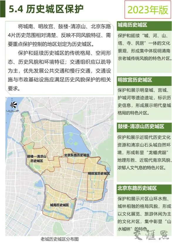 此前2023年版本新增北京东路历史城区,共划定鼓楼—清凉山片区、老城南片区和明故宫片区等四个历史城区,城墙内超一半面积被列入保护。