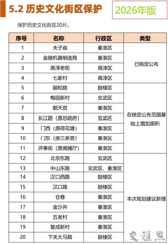 历史文化街区数量拟扩大近一倍。南京将加强对历史文化街区、历史地段整体风貌的保护和延续;历史文化街区、历史地段的保护范围内,以及重要文物古迹临近区域,新建必要的基础设施应与相应的历史风貌相协调。