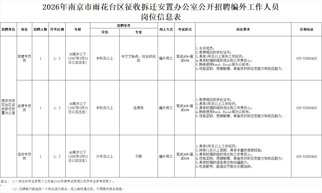 因业务需要,按照“公开、平等、竞争、择优”的原则,南京市雨花台区征收拆迁安置办公室现面向社会公开招聘编外工作人员3名,从事相关工作。现将有关事项公告如下: