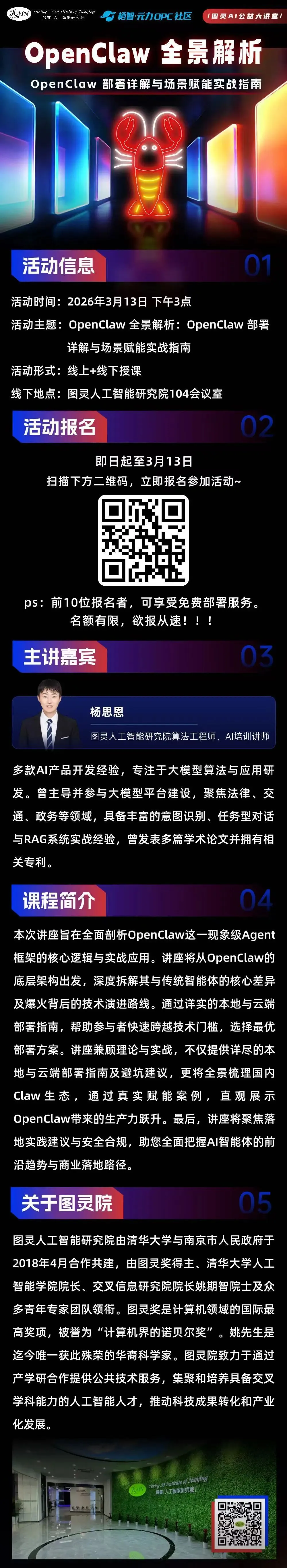5. 社区办公孵化支持。为从事OpenClaw等研发的OPC社区入驻主体提供最长2年免费独立工位使用期,免缴水电、物业及网络使用费,开放社区共享空间、路演大厅、测试场域等孵化资源,实现“零成本启动”开发。