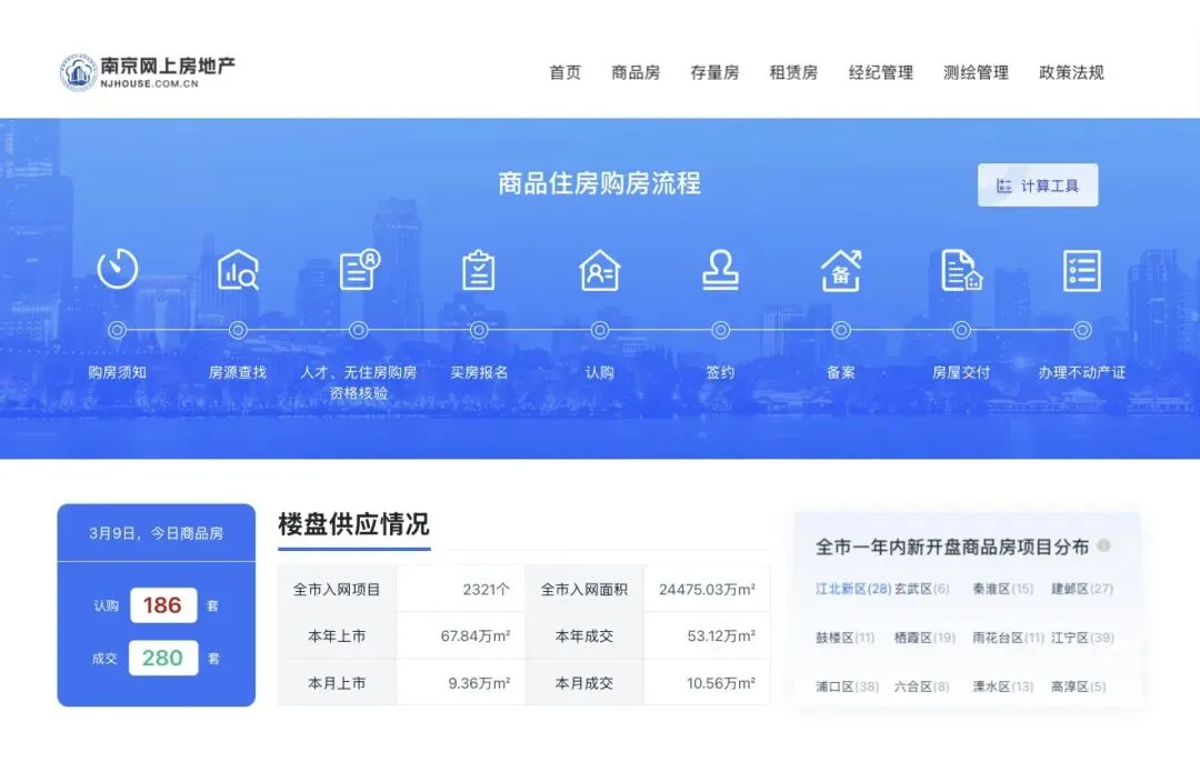 据南京网上房地产官方数据,截止到2026年3月9日,南京商品房认购186套,成交280套。