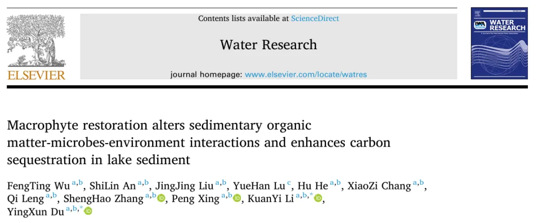 Wu, FengTing, ShiLin An, JingJing Liu, YueHan Lu, Hu He, XiaoZi Chang, Qi Leng, et al. 2026. Macrophyte Restoration Alters Sedimentary Organic Matter-Microbes-Environment Interactions and Enhances Carbon Sequestration in Lake Sediment. Water Research, January, 125658. https://doi.org/10.1016/j.watres.2026.125658.