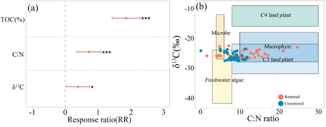 碳封存增强:恢复区沉积物总有机碳含量比未恢复区高出约80%,C/N比和δ¹³C显示有机质来源由藻类向植物和微生物转变。