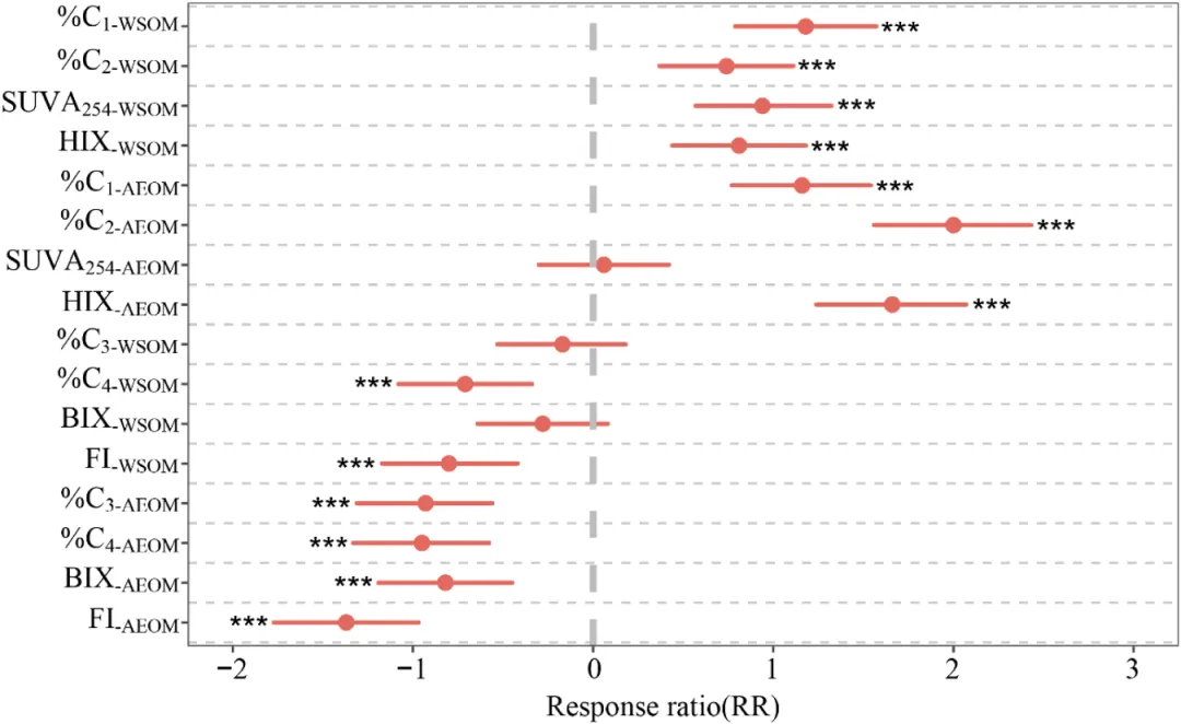 统计分析:使用Hedges' d效应量、主成分分析、冗余分析、偏最小二乘路径模型等方法,解析有机质、微生物和环境因子对碳库的影响路径。