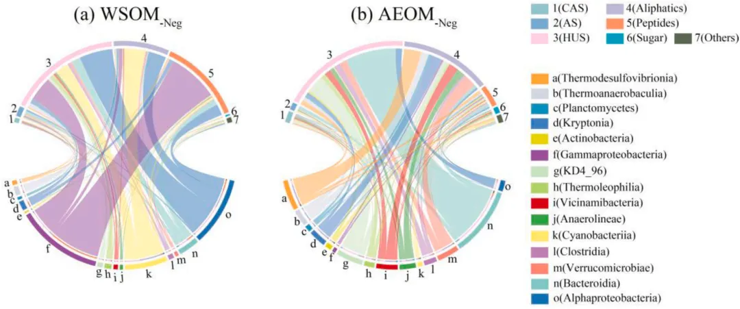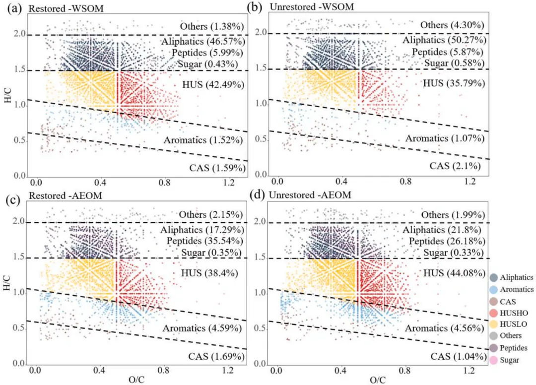 图3:恢复区(a、c)与未恢复区(b、d)水溶性有机质和碱性提取有机质的分子组成