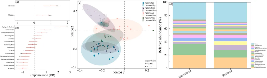 图4:恢复对前15个微生物纲的影响。(a) α多样性;(b) 加权响应比;(c) 微生物β多样性;(d) 各纲的相对丰度