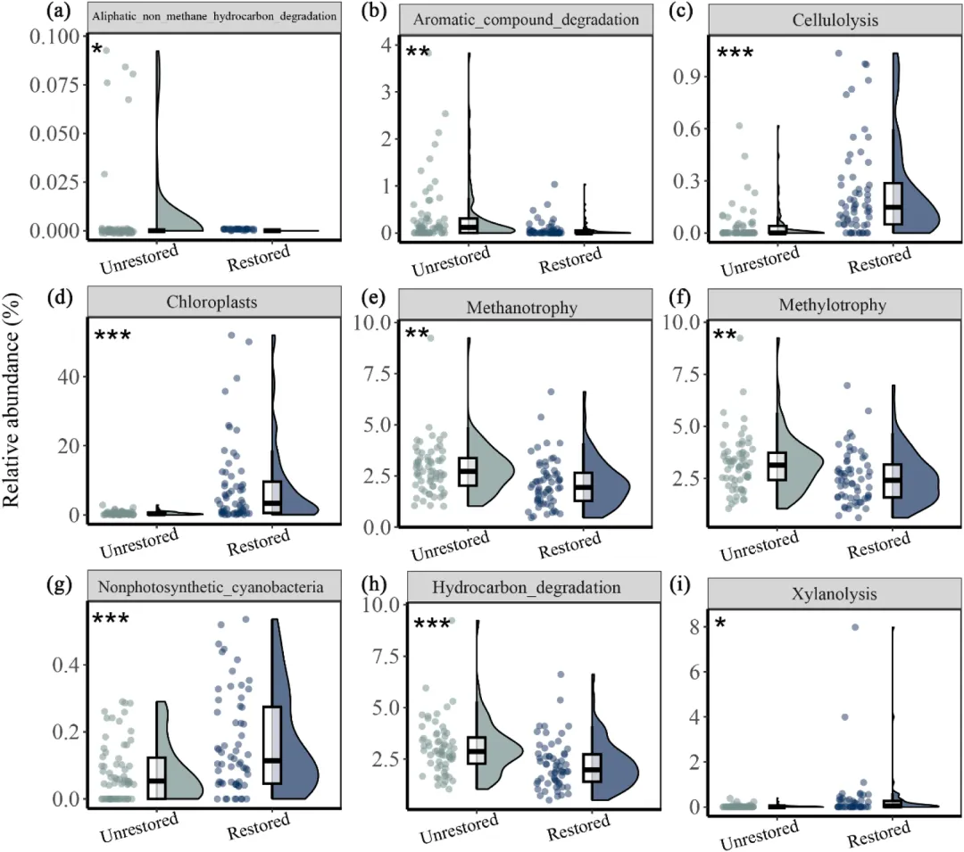 微生物群落重构:恢复区微生物丰富度和多样性显著提高,α-变形菌、蓝藻和热厌氧杆菌富集,而γ-变形菌等与易降解碳相关的类群减少。功能预测显示,与纤维素分解相关的功能增强,而与甲烷氧化和芳香族化合物降解相关的功能减弱。