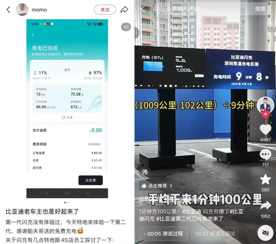 随着比亚迪“闪充中国”战略规划的发布,一张覆盖全国的闪充网络正加速铺开。根据规划,到2026年底,比亚迪将在全国建设20000座闪充站,让闪充真正遍布全中国。其中,比亚迪将与全国充电网络运营商协同合作,以“闪充站中站”模式加速建设,预计到年底建成18000座。在覆盖范围上,实现一二线城市3公里内、三四线城市5公里内、五六线城市6公里内即可抵达闪充站,把闪充站真正铺到用户家门口。此外,比亚迪“闪充高速站”将覆盖近三分之一的高速公路服务区,预计到今年年底落成2000座,实现平均每隔100多公里就有一座闪充站,并承诺在今年“五一”前首批建成1000座,让用户假日出行无忧。南京这两座闪充示范站成为全国闪充网络布局的先行样板,让“充电和加油一样快”的体验从梦想照进现实。比亚迪董事长王传福表示,截至2026年3月5日,比亚迪已建成4239座闪充站。南京广电·牛咔视频记者在“比亚迪闪充”App搜索发现,目前全市已有26座比亚迪闪充站。同时,在社交媒体上已经有网友分享自己的“尝鲜”体验,不少人表示被其超快的充电速度惊艳。从“充电焦虑”到“充电自由”,比亚迪闪充站正在悄悄改变车主对新能源车的认知。