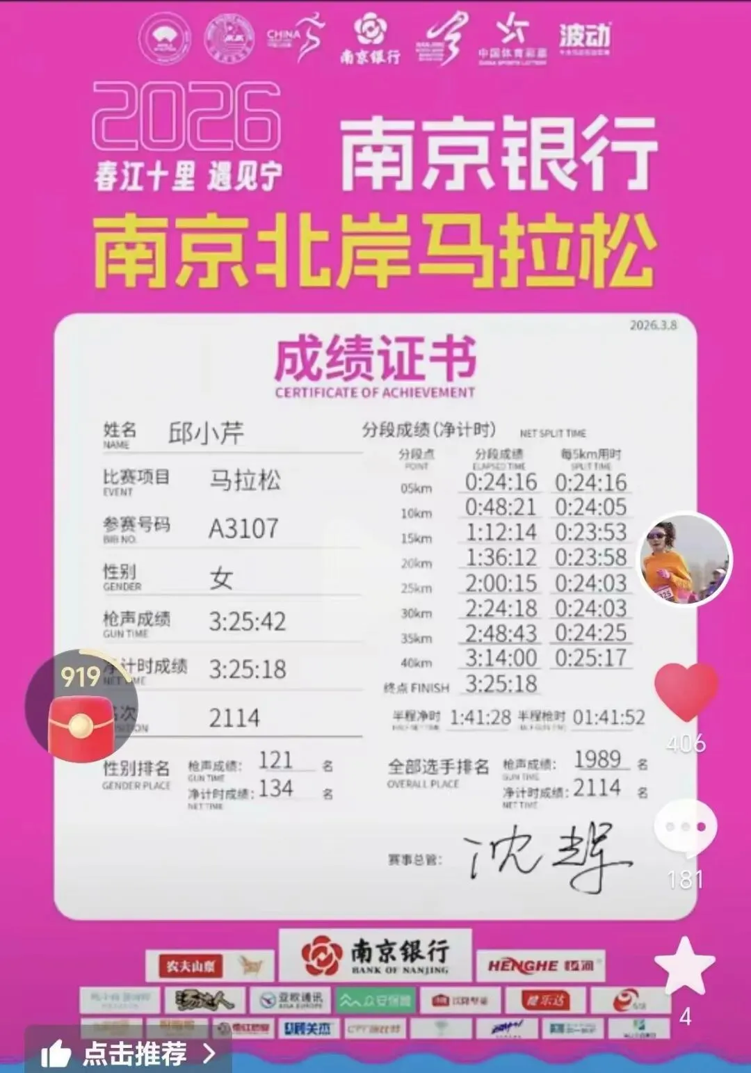 本次赛事中,邱小芹佩戴参赛号码A3107,以净计时3小时25分18秒的成绩冲过终点线,在全部选手中排名第2114位,在女子组别中位列第134名,半程分段净时更是达到1小时41分28秒,展现了稳健的配速与持久的耐力。