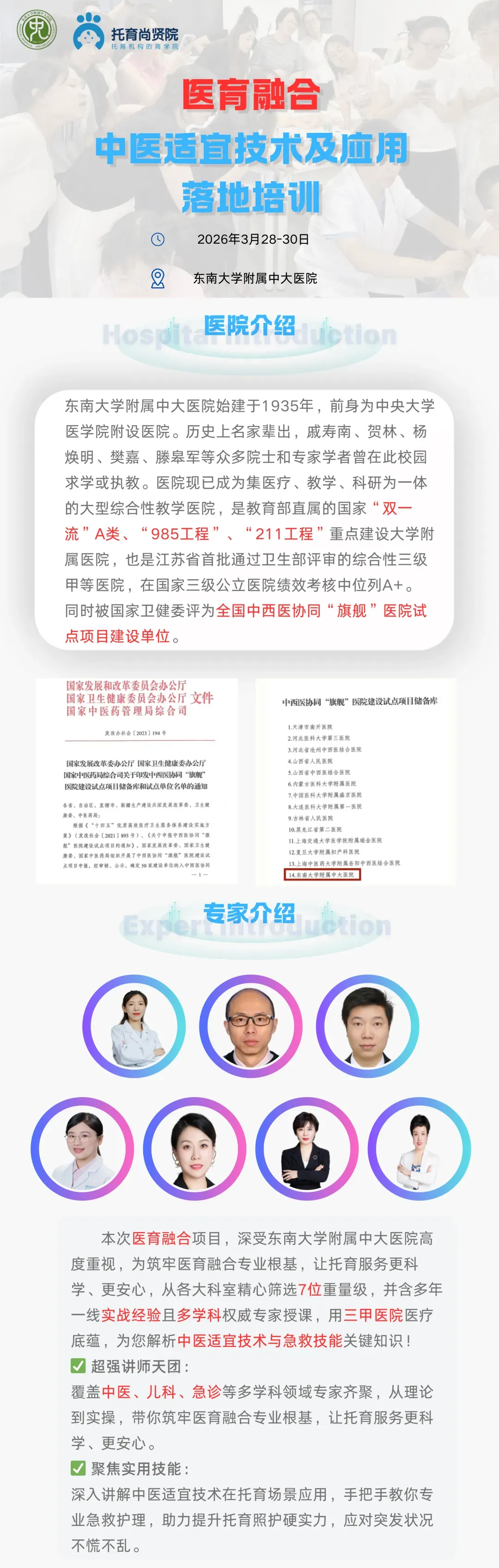 2026年 3月28-30日在南京,东南大学附属中大医院技能中心、托育尚贤院推出 “医育融合・中医适宜技术及应用落地培训(2天半)”,从理论实操到实地参访,为托育从业者打造全维度专业成长路径。