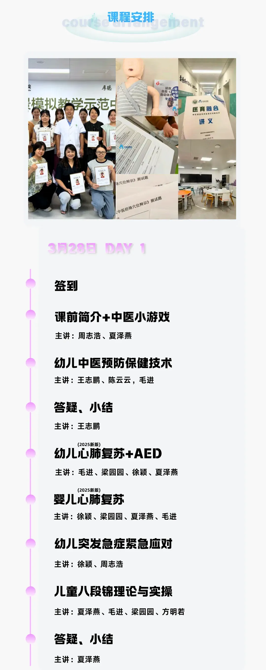 课程设置上,前两日涵盖婴幼儿营养调理、中医预防保健技术、2025版婴幼儿心肺复苏 + AED、婴幼儿伤害预防与处置、儿童八段锦理论与实操、24节气膳食与养育、医育融合落地流程等核心内容,理论 + 实操双轨并行;