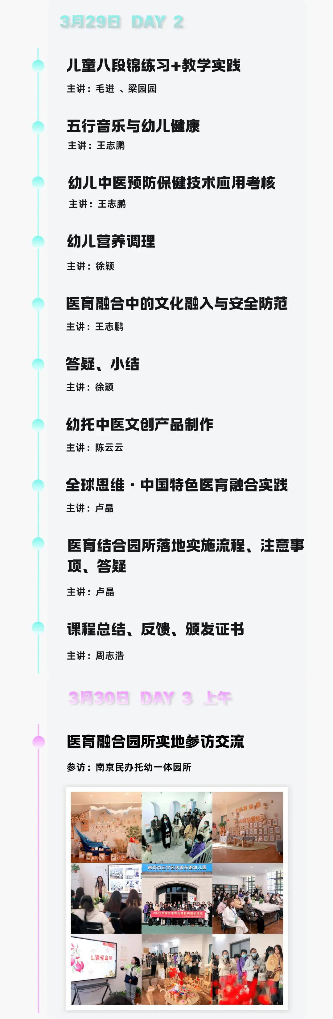 第三天特别增设医育融合园所实地参访交流(参访南京民办托幼一体园所),让你直击医育融合落地场景,从理论到实践全方位掌握专业技能。