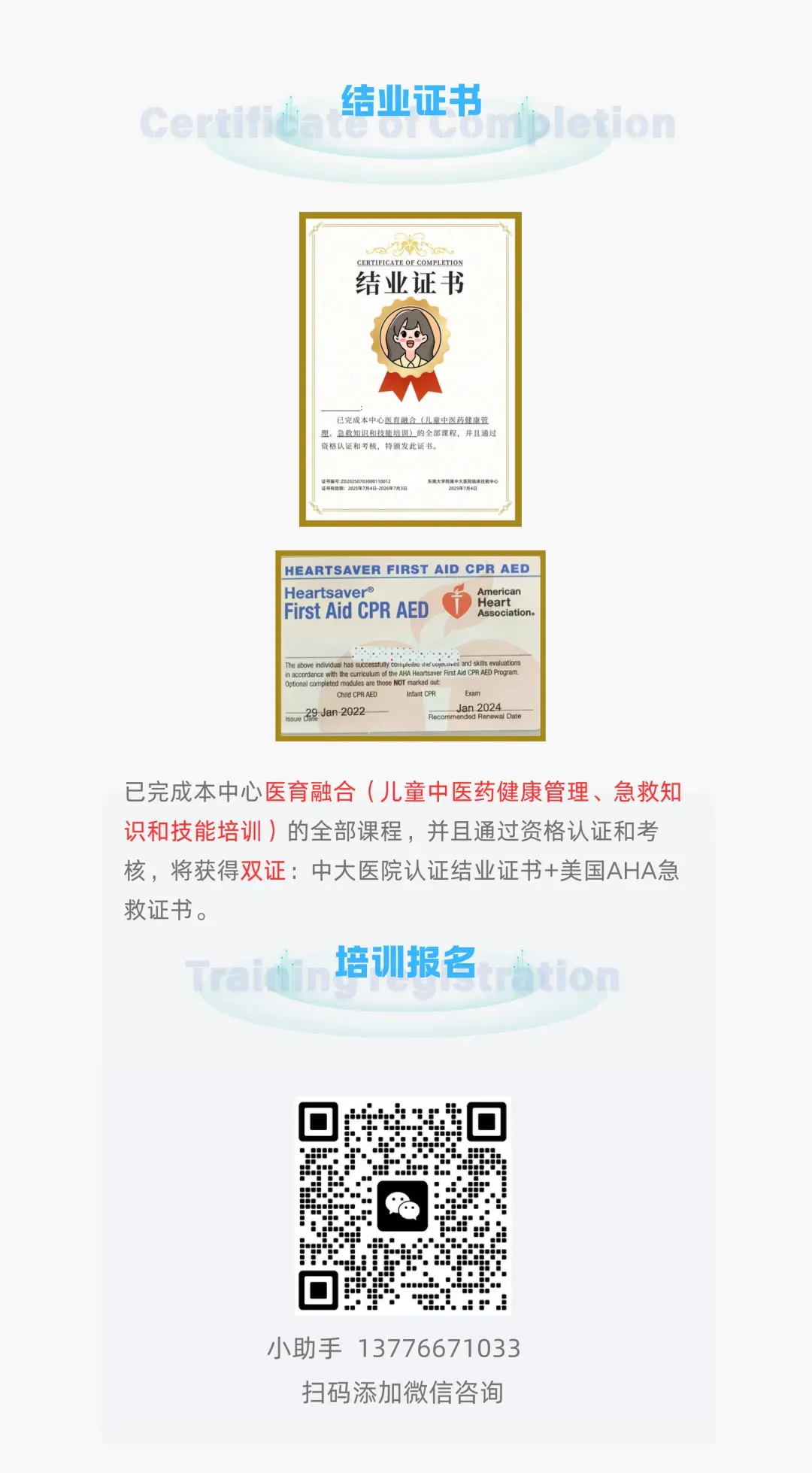 完成全部课程并通过考核,将获得①中大医院技能中心认证结业证书 ② 美国 AHA 急救证书,双证加持为职业发展赋能。
